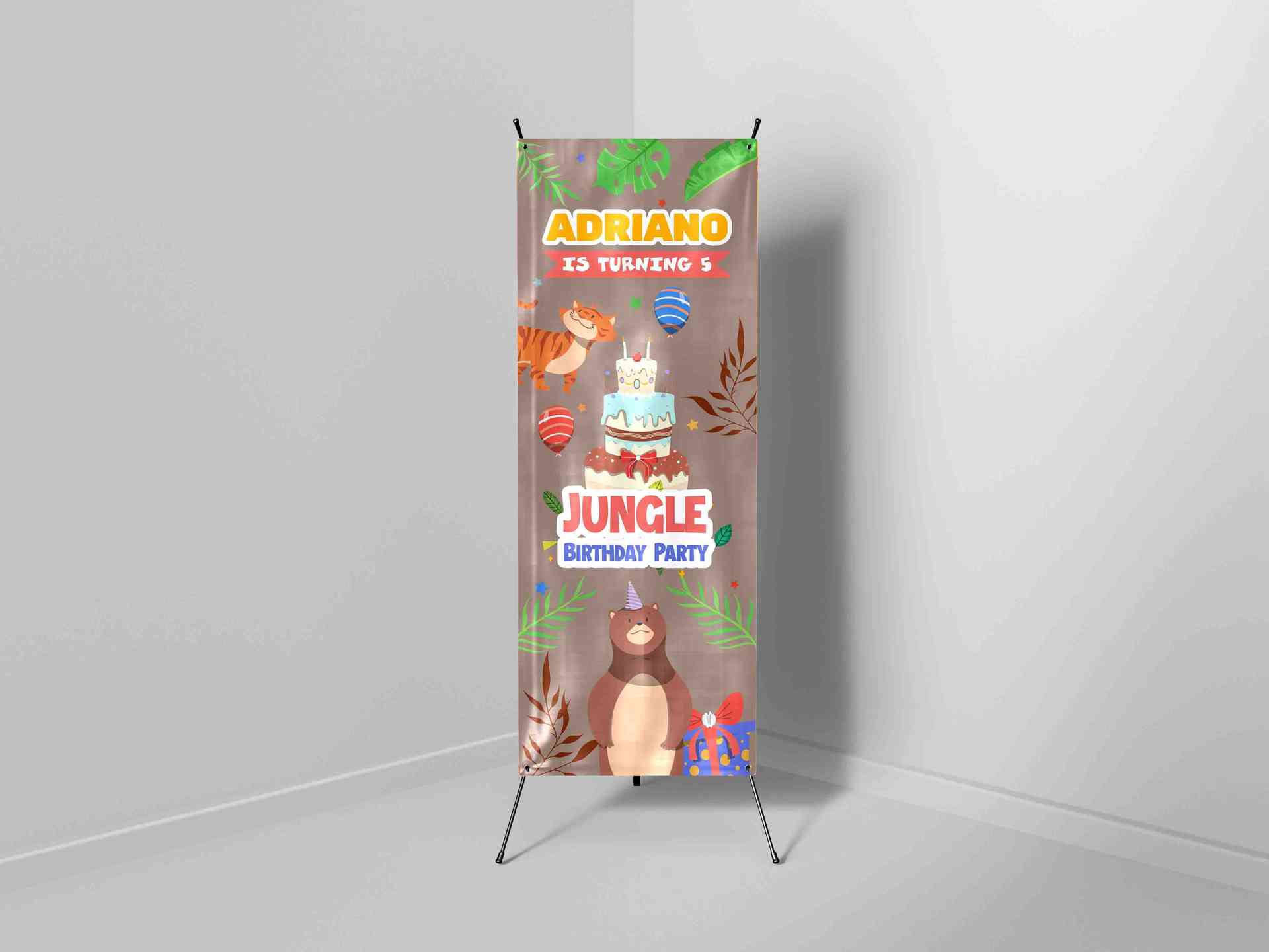 X-banner ini didesain dengan tema hutan atau jungle yang menyenangkan untuk merayakan ulang tahun ke-5 Adriano. Latar belakang coklat muda menyerupai...
