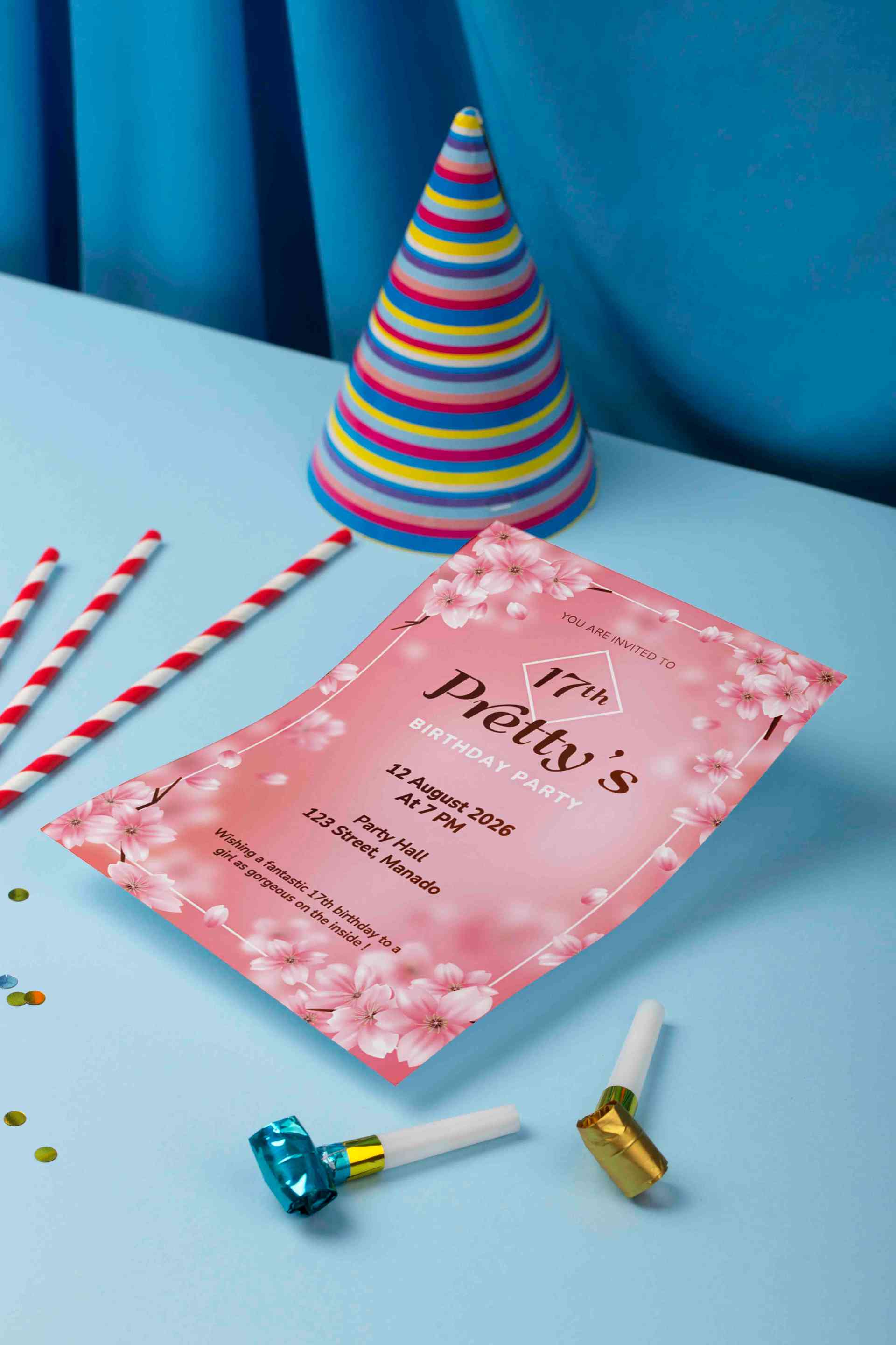 Desain x-banner ini dibuat khusus untuk merayakan ulang tahun ke-17 dengan tema yang ceria dan penuh warna. Latar belakangnya memadukan gradasi pink,...