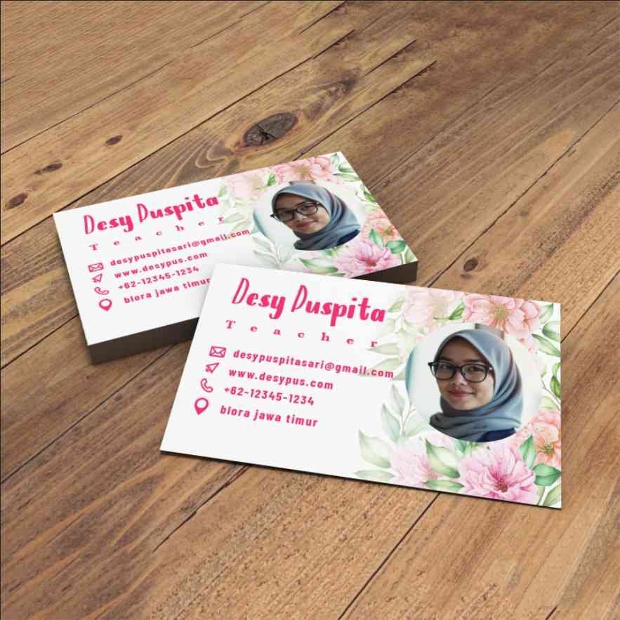 Kartu nama ini dirancang dengan nuansa cerah dan penuh kehangatan, menggabungkan latar putih bersih dengan ornamen bunga pink pastel yang mengelilingi...