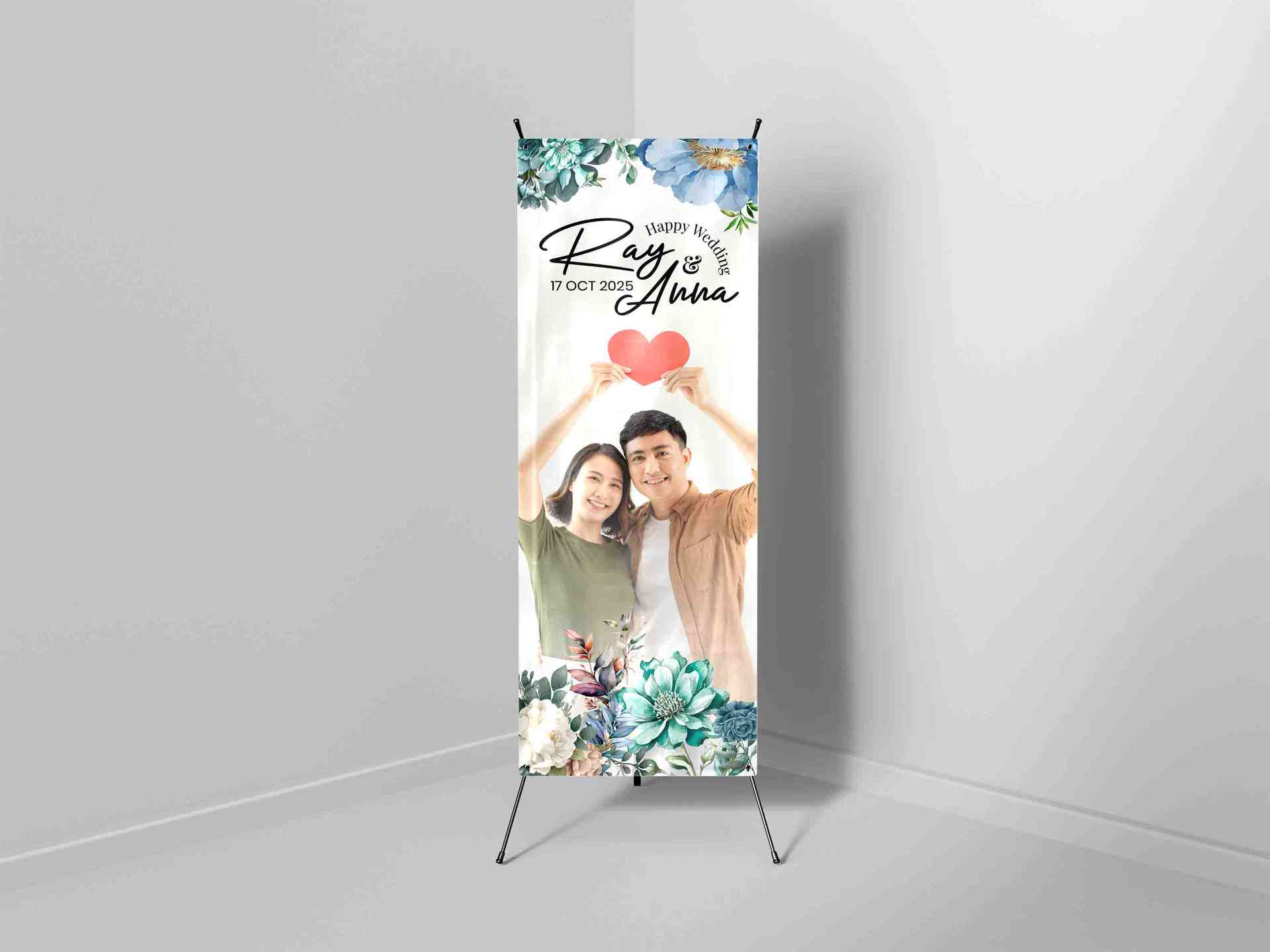 Desain X-Banner ini menampilkan konsep elegan natural dengan nuansa putih bersih dan sentuhan floral di sudut-sudutnya, menciptakan kesan hangat dan romantis. Di bagian tengah terdapat foto pasangan pengantin dengan pencahayaan lembut, memberikan atmosfer bahagia dan penuh cinta. Tipografi nama "Michael & Michelle" ditulis dengan gaya handwriting modern berwarna olive green, menambah sentuhan personal dan estetik. Banner ini cocok digunakan sebagai penyambut tamu di acara pernikahan, membuat momen spesial terasa lebih intim dan berkesan.