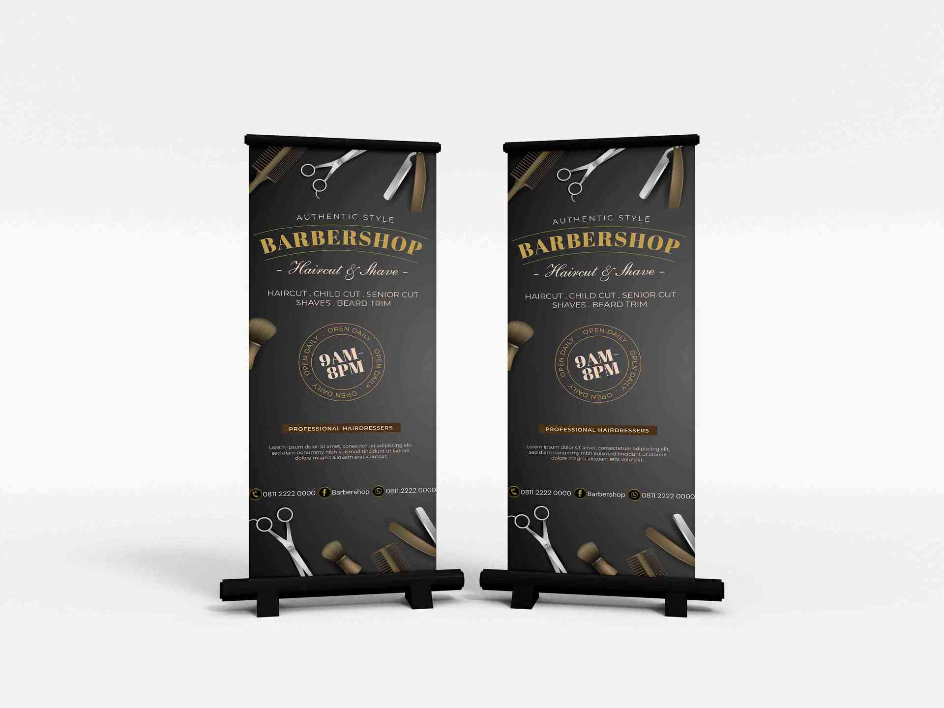 Roll up banner ini dirancang dengan konsep elegan dan maskulin, menghadirkan kombinasi warna hitam dan emas yang mempertegas kesan profesional barbers...