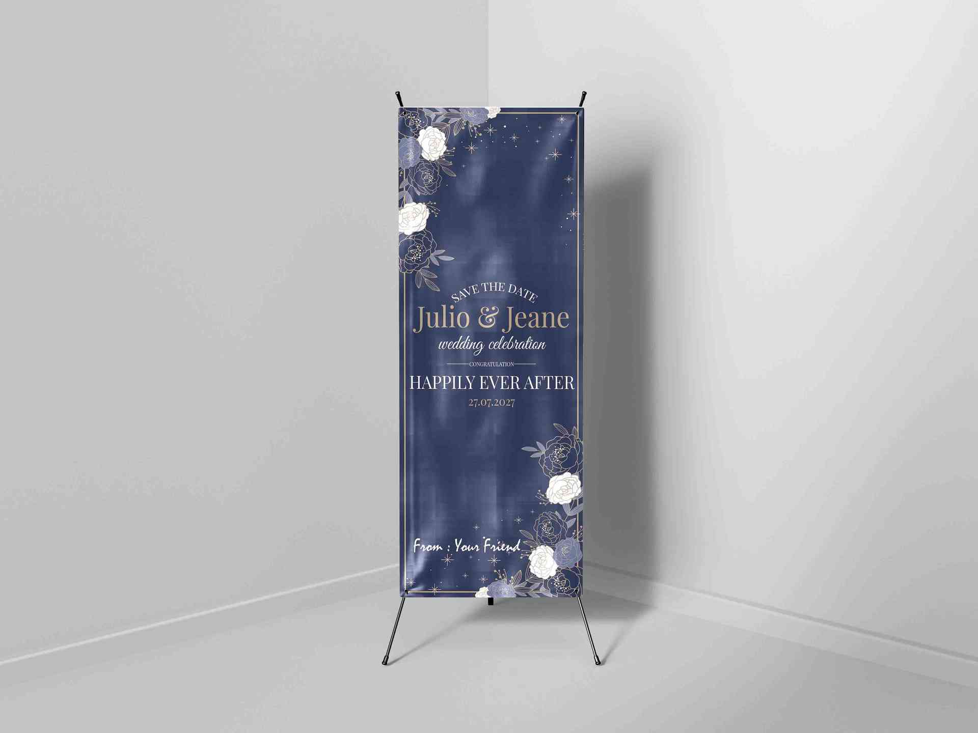 X Banner Wedding ini tampil unik dengan konsep foto kolase vertikal yang menampilkan beberapa momen manis pasangan, memberikan kesan personal dan hang...