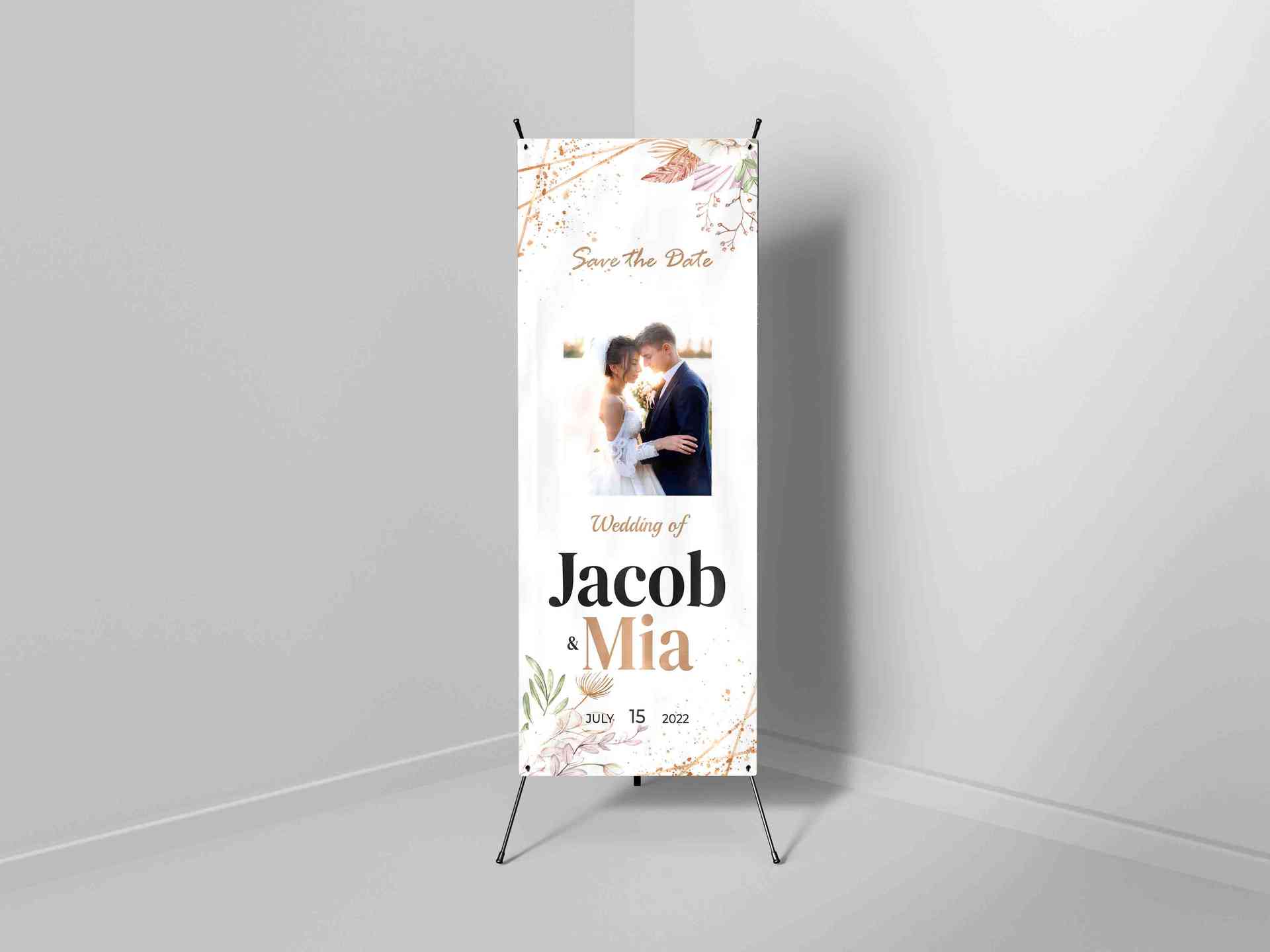 X Banner Wedding ini menghadirkan desain klasik elegan dengan dominasi warna putih dan gold lembut, menonjolkan foto pasangan secara penuh untuk membe...