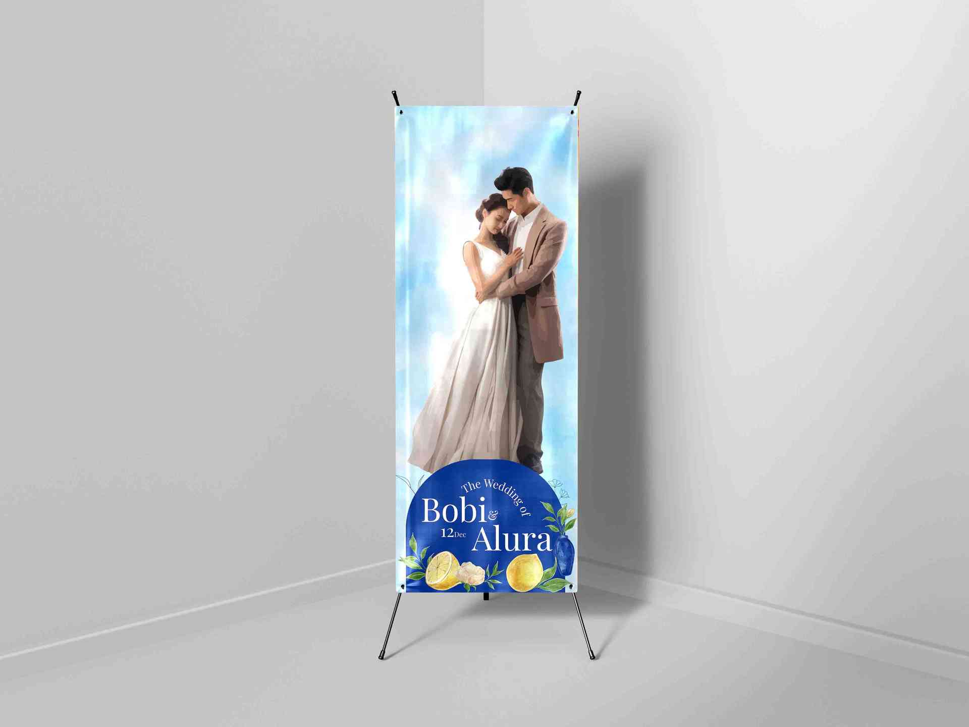 X Banner Wedding ini tampil unik dengan konsep foto kolase vertikal yang menampilkan beberapa momen manis pasangan, memberikan kesan personal dan hang...