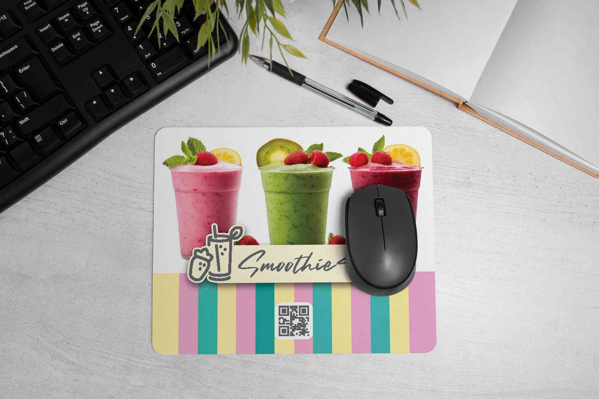 Mousepad ini hadir dengan desain yang fun dan penuh energi, menampilkan tiga gelas smoothies dalam warna pink, hijau, dan ungu yang menggoda selera. D...