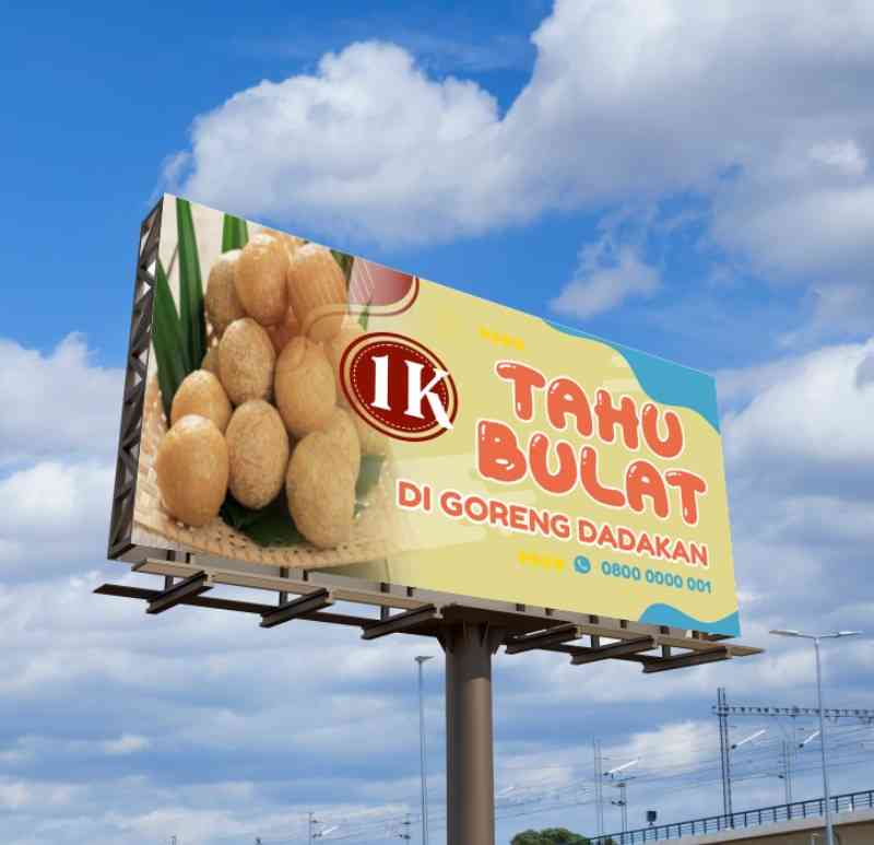 Desain baliho ini menggunakan perpaduan warna kuning cerah dan merah marun,memberi kesan hangat,ceria,dan menggugah selera. Judul besar “TAHU BULAT” t...