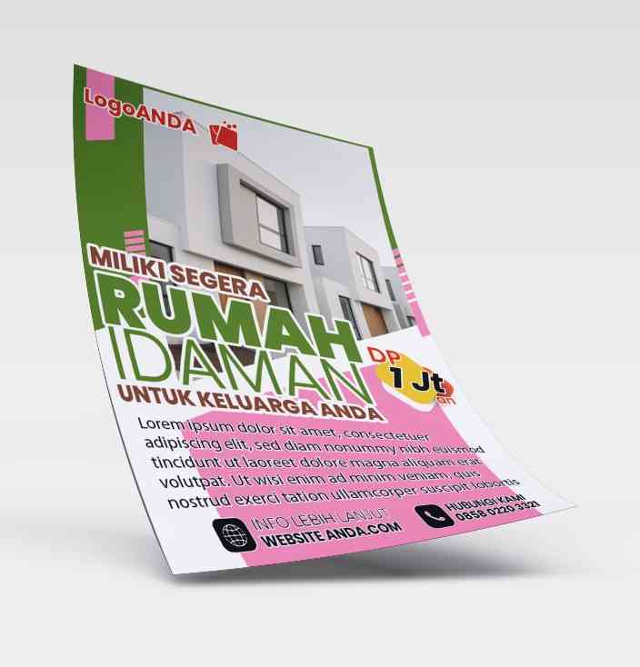 flyer brosur promosi properti bergaya modern dan minimalis sebagai media promosi, menampilkan slogan “Miliki Segera Rumah Idaman untuk Keluarga Anda”....