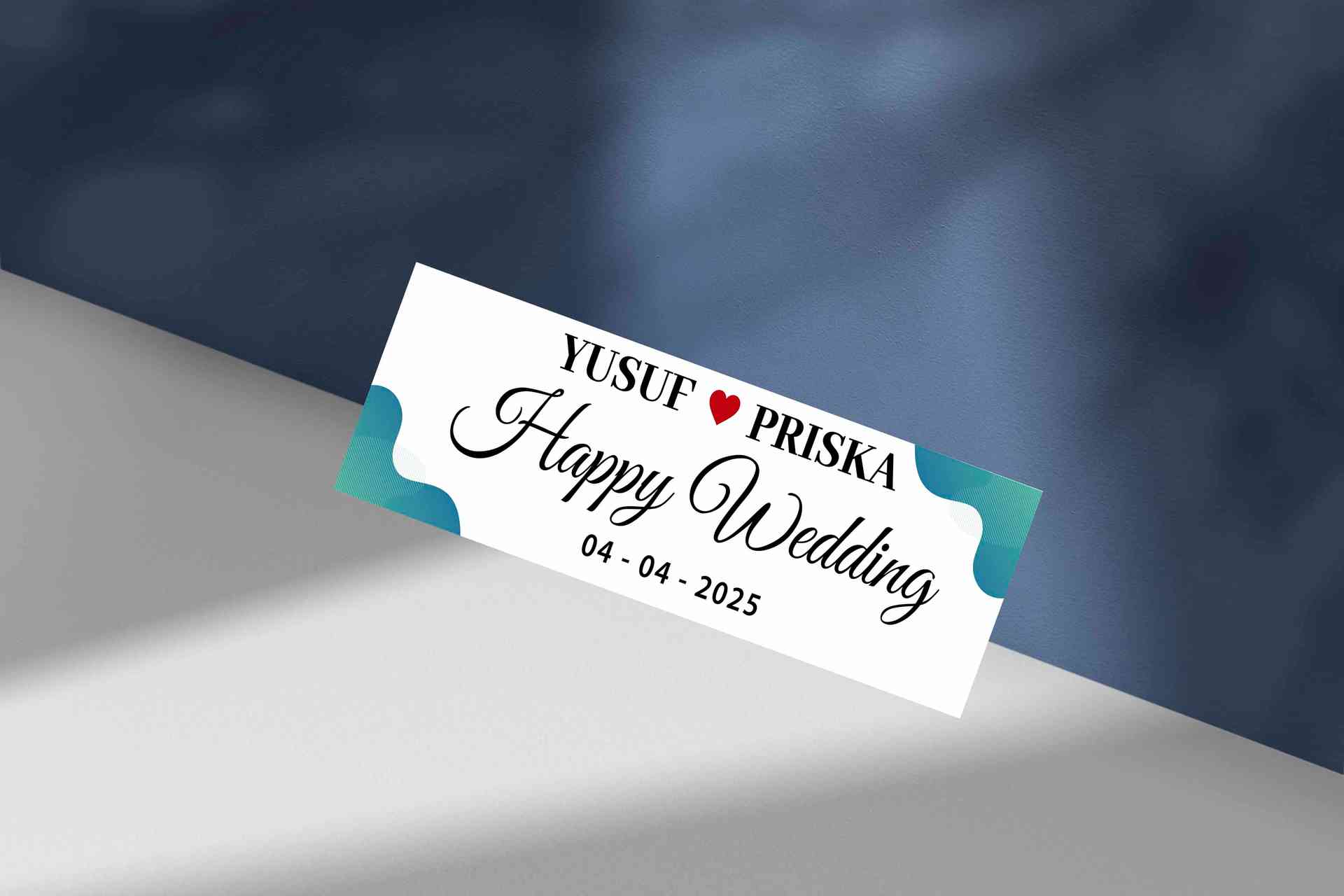 Dengan latar putih bersih dan aksen gelombang biru di kedua sisi, desain ini memancarkan kesan modern dan minimalis. Plat ini cocok untuk pernikahan b...