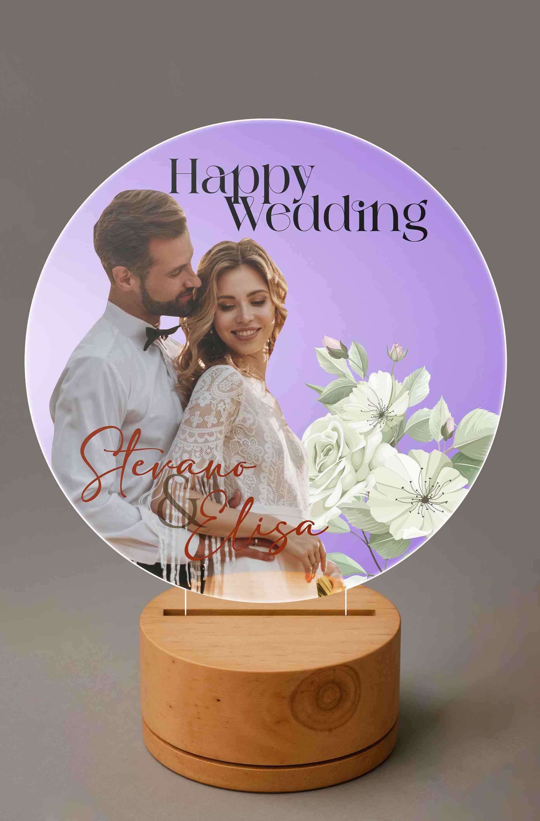 Wedding plat ini menampilkan desain sederhana namun sangat elegan dengan latar belakang gradasi warna biru keunguan yang menenangkan. Tulisan Happy We...