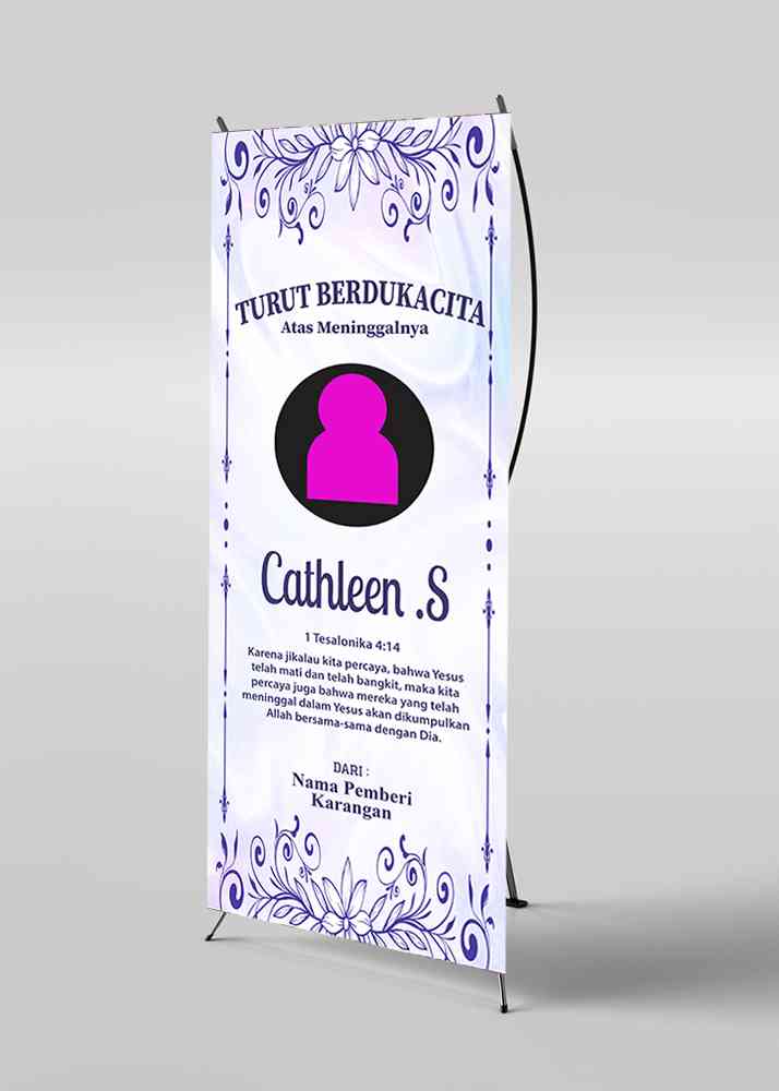 Acrylic Sign Tripod Kedukaan ini berbentuk persegi panjang vertikal dengan dominasi warna pastel, terutama pink dan hijau, serta dihiasi elemen floral seperti bunga mawar dan dedaunan di bagian atas dan bawah. Desain visual menonjolkan tipografi elegan bertuliskan "Rest in Peace" serta ruang kosong untuk nama almarhum dan pengirim, dilengkapi ilustrasi siluet dengan aksen floral romantis yang hangat. Produk ini berfungsi sebagai papan ucapan belasungkawa untuk memperingati kepergian seseorang, cocok untuk digunakan dalam acara pemakaman atau memorial, menyasar keluarga, kolega, atau kerabat sebagai target pasar yang ingin memberikan penghormatan terakhir dengan tampilan yang lembut dan penuh perhatian.