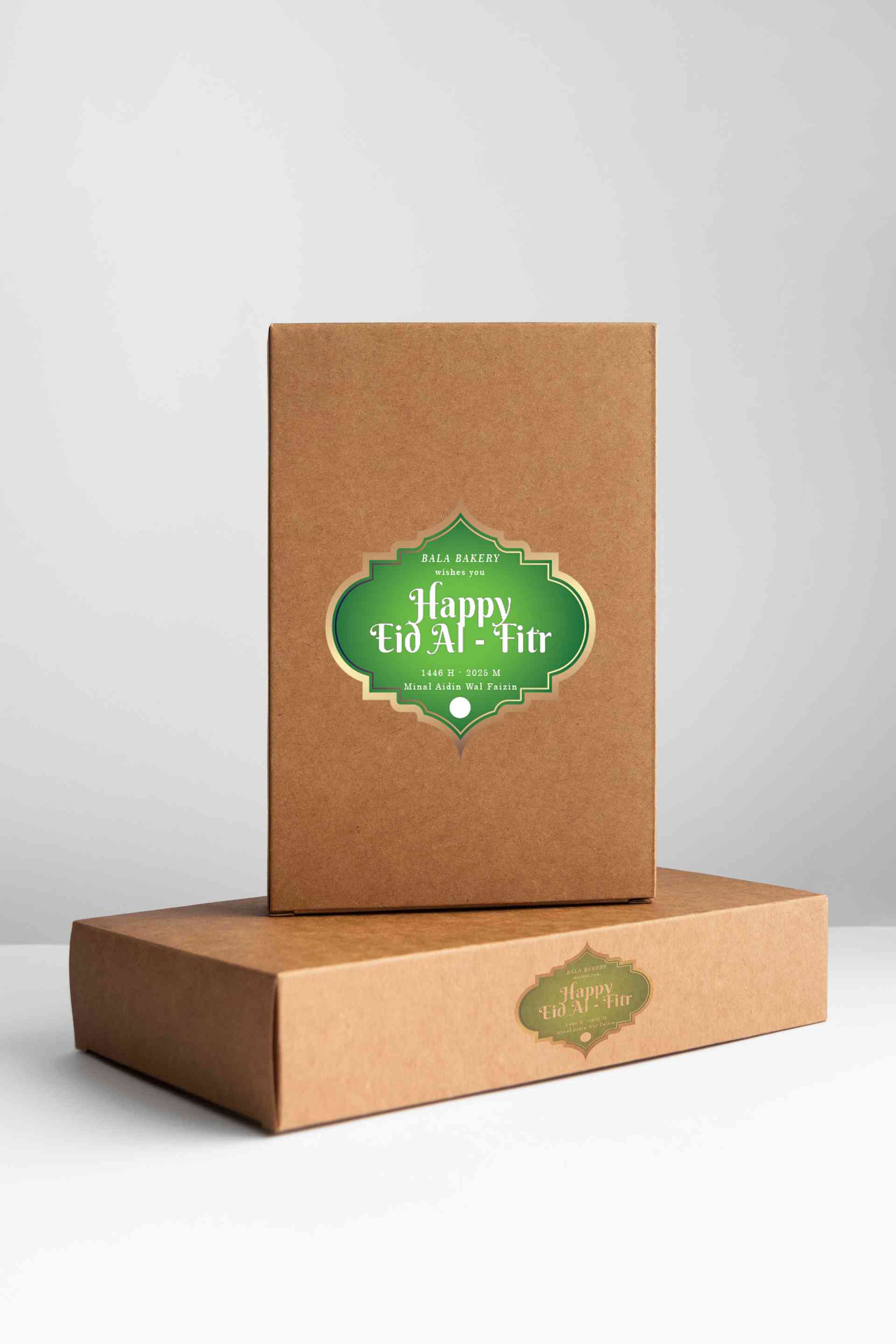 Stiker ini merupakan label bertema Idul Fitri yang ditempelkan pada kemasan kotak berbahan kraft coklat. Desainnya menggunakan elemen khas islami deng...