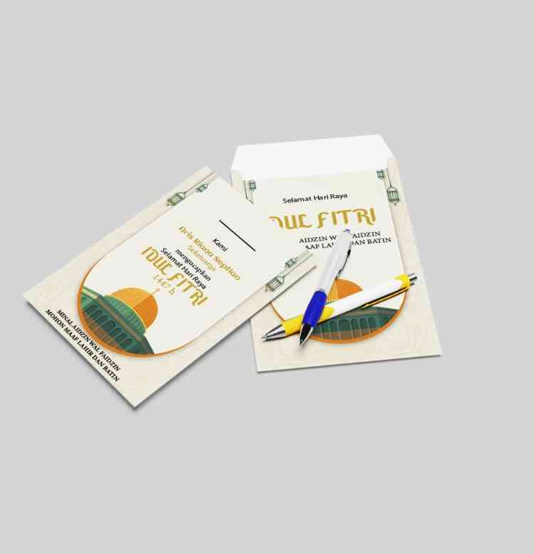 Desain kartu dan amplop ini mengusung konsep minimalis dengan latar putih bersih yang dipadukan dengan sentuhan motif emas halus. Di bagian atas, lentera-lentera kuning keemasan tergantung rapi bersama simbol bulan sabit, menciptakan suasana hangat dan penuh berkah khas Idul Fitri. Warna-warna lembut yang digunakan menampilkan kesan anggun dan bersahabat.
