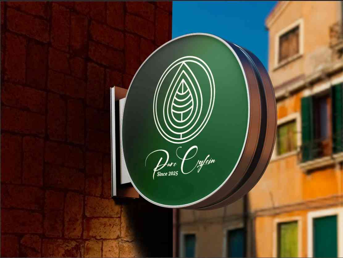 Sign Box berbentuk bulat dengan warna dominan hijau tua, dilengkapi border tipis berwarna terang yang memberikan kesan modern dan profesional. Di teng...