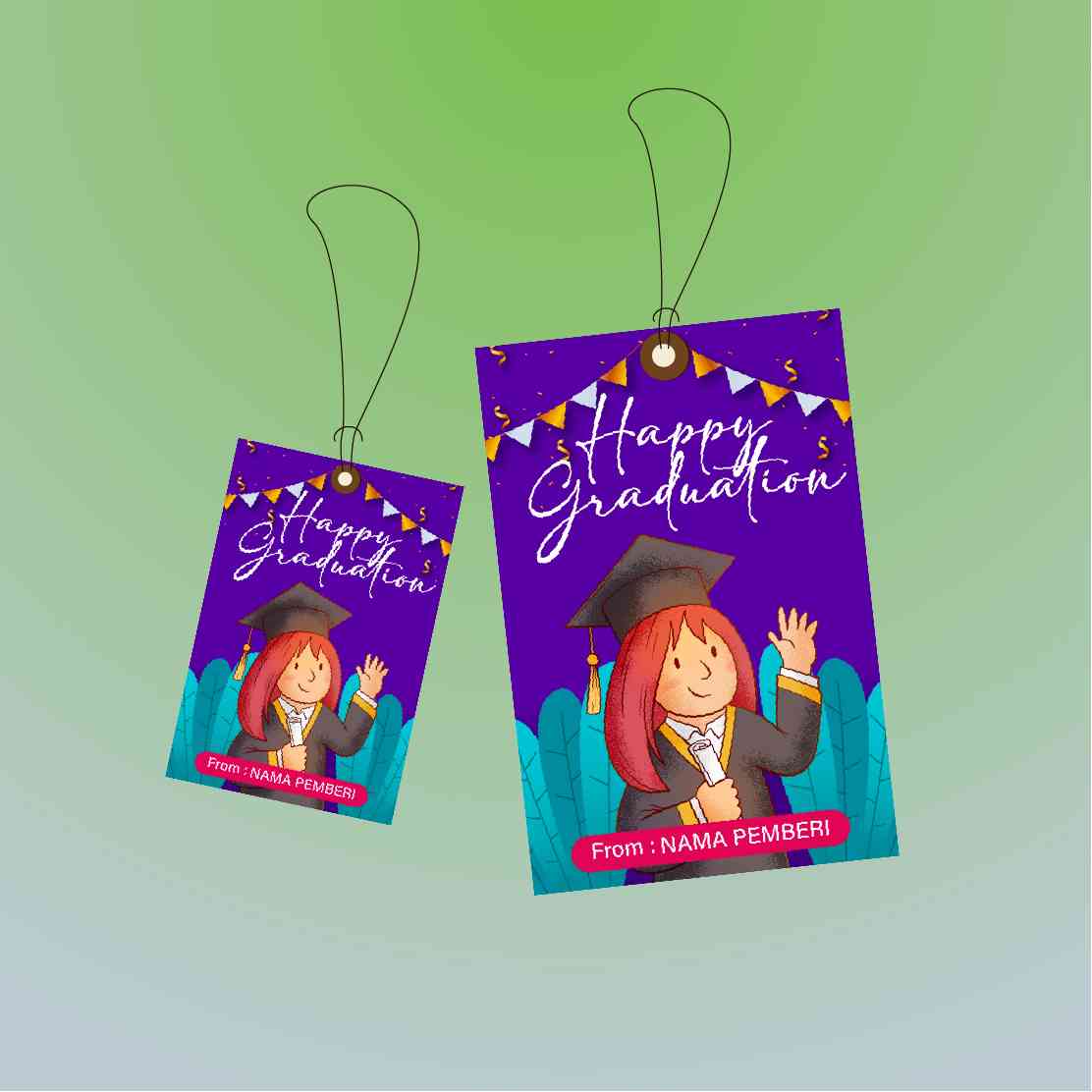Desain penuh warna dengan background ungu dan ilustrasi gadis muda berjubah wisuda, menciptakan nuansa semangat dan kebanggaan. Aksen confetti dan ben...