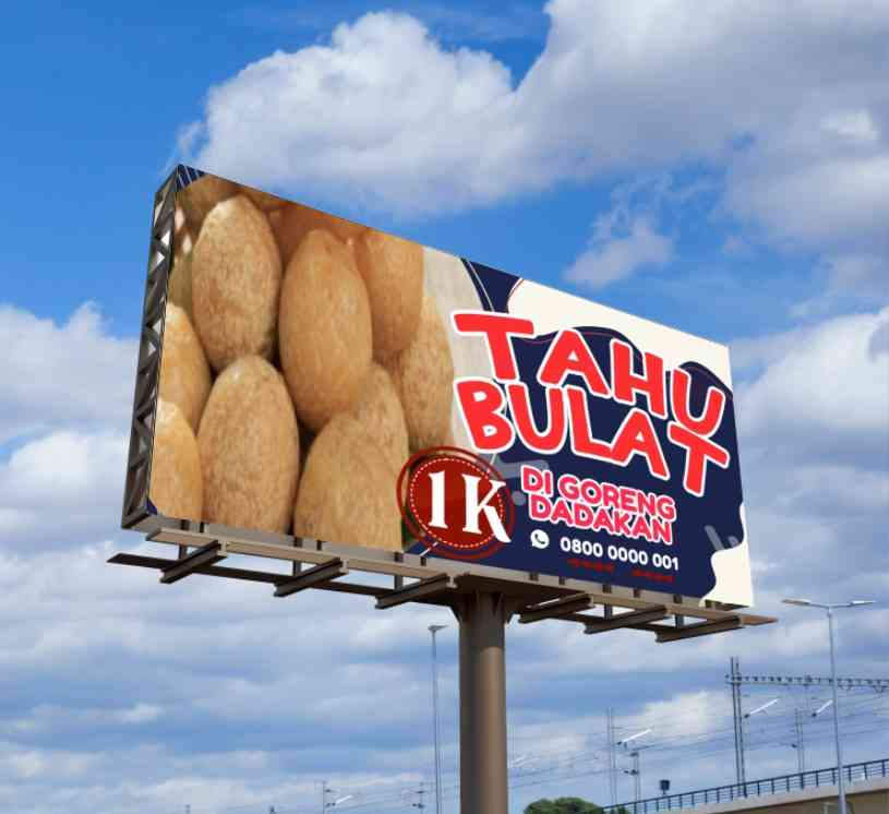 Desain baliho ini menggunakan perpaduan warna kuning cerah dan merah marun,memberi kesan hangat,ceria,dan menggugah selera. Judul besar “TAHU BULAT” t...