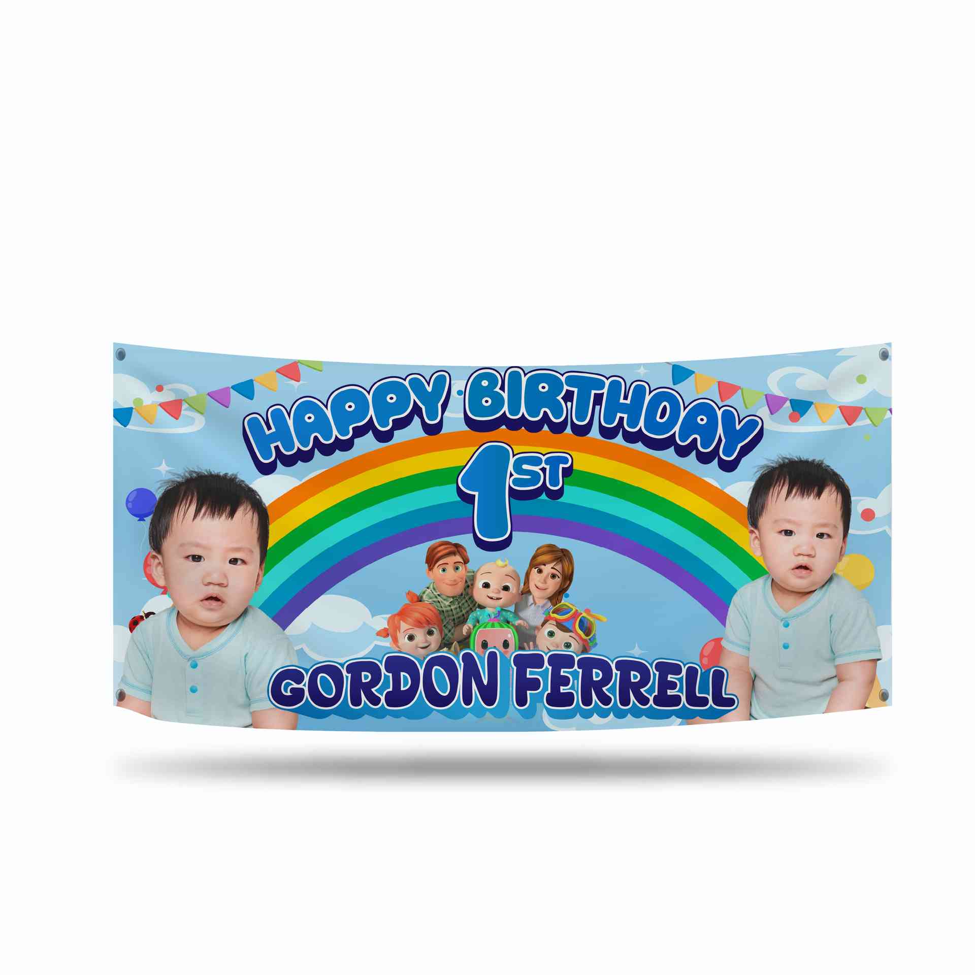 Rayakan hari spesial dengan keajaiban dari dunia Cocomelon! Baliho ulang tahun ini menghadirkan tema ceria dengan latar belakang langit biru yang inda...