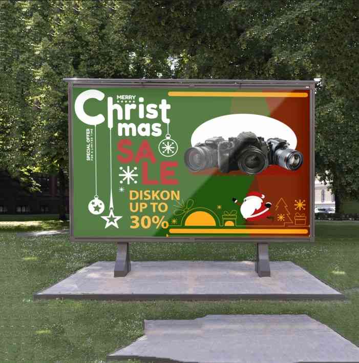 Baliho promosi bertema Natal ini menampilkan desain persegi panjang dengan warna dominan hijau dan merah, serta elemen visual khas perayaan seperti or...