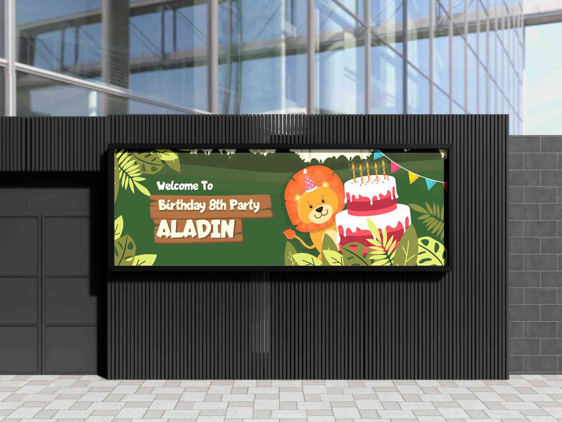 Desain baliho ini dibuat khusus untuk merayakan ulang tahun anak dengan tema safari yang ceria dan menggemaskan. Berlatar belakang hutan hijau dan ded...