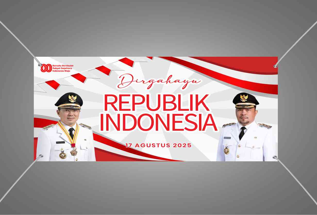 Spanduk perayaan HUT ke-80 Republik Indonesia ini berbentuk persegi panjang horizontal dengan warna dominan merah dan putih, menonjolkan nuansa nasionalisme. Elemen visual utama berupa dua sosok berpakaian dinas resmi berlatarkan gradasi merah-putih, menegaskan tema kenegaraan. Judul “Bersatu dan Berdaulat: Indonesia 80 Tahun Tetap Jaya” serta ucapan selamat HUT RI 17 Agustus 2025 ditulis jelas menggunakan tipografi tegas dengan aksen merah mencolok. Produk ini berfungsi sebagai media promosi dan ucapan institusi bisnis atau pemerintahan dalam konteks perayaan nasional, menargetkan perusahaan, instansi, dan masyarakat umum.