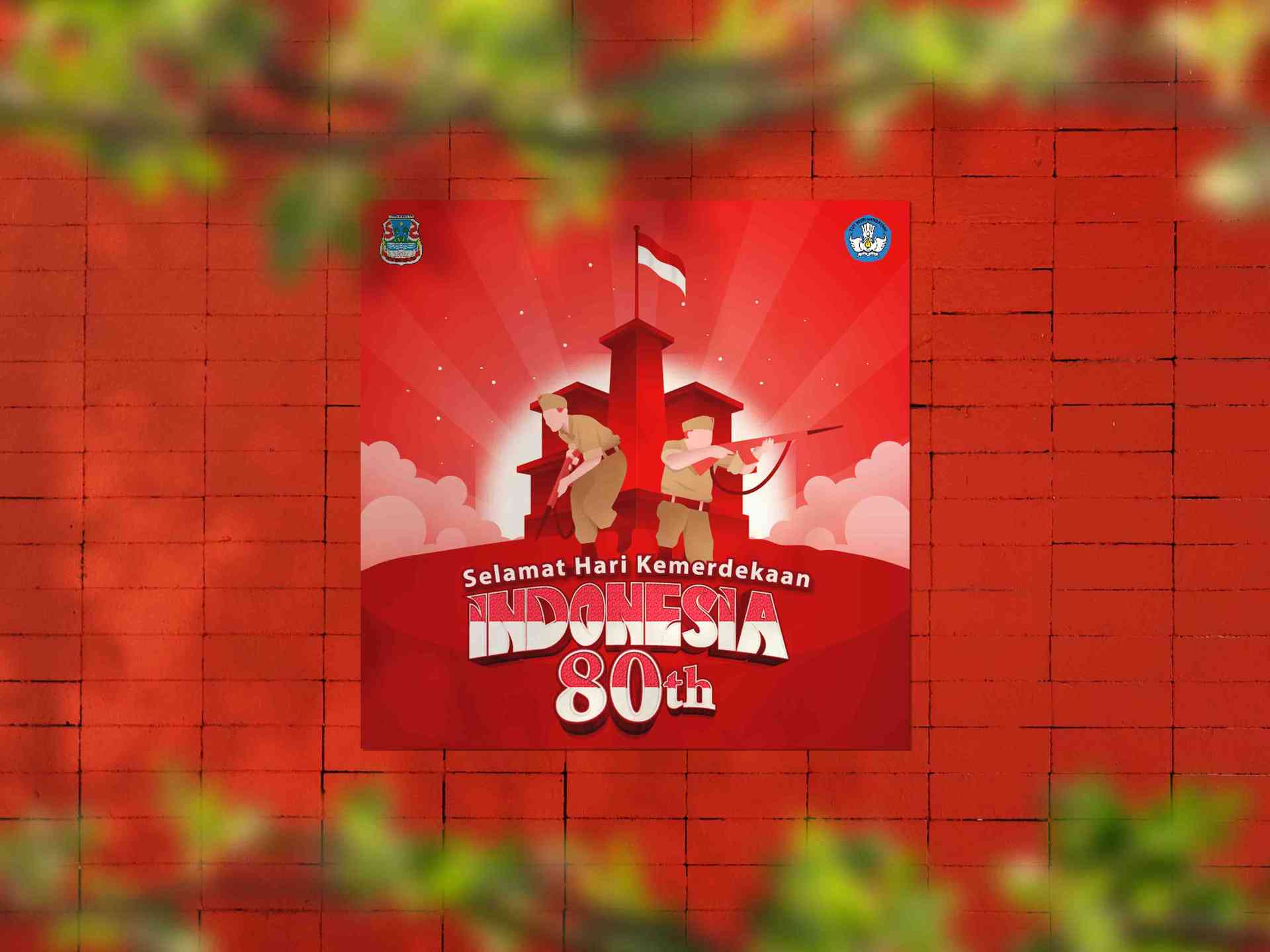 Baliho bertema Kemerdekaan Indonesia ke-80 ini berbentuk persegi dengan warna dominan merah dan putih, menampilkan ilustrasi dua pahlawan berseragam d...
