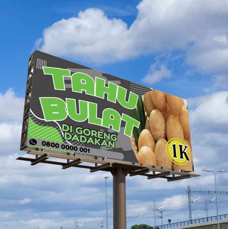 Desain baliho ini menghadirkan nuansa maskulin dan urban dengan dominasi warna hitam, abu-abu, dan hijau neon. Teks “TAHU BULAT” tampil besar dan bold...