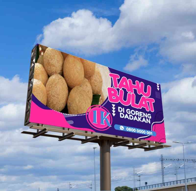 Desain baliho ini menggunakan perpaduan warna kuning cerah dan merah marun,memberi kesan hangat,ceria,dan menggugah selera. Judul besar “TAHU BULAT” t...