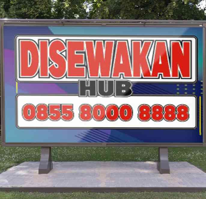 Papan reklame ini dirancang dengan gaya tegas dan langsung, menampilkan kata "DISEWAKAN" dalam huruf kapital besar berwarna merah menyala dengan outline putih dan hitam, untuk menarik perhatian dari kejauhan. Di bawahnya, terdapat kata "HUB" berwarna hitam pekat yang memperkuat ajakan untuk menghubungi. Nomor telepon 0855 8000 8888 tercetak besar dengan gradasi merah ke oranye dan efek outline yang mempertegas visibilitasnya. Latar bawah belakang menambahkan kesan untuk memperkuat daya tarik visual papan ini.