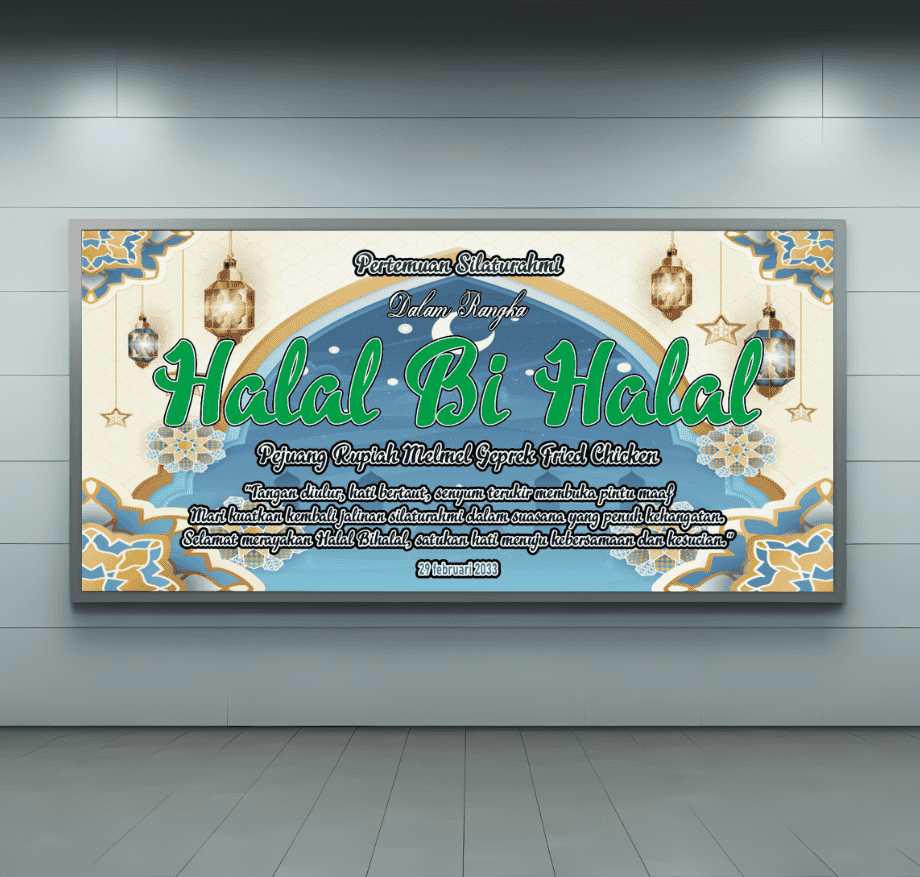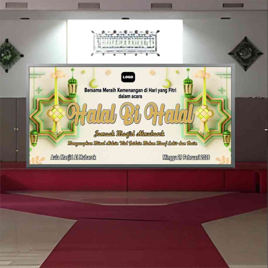 Tipografi tulisan "Halal Bi Halal" menggunakan huruf kaligrafi modern dengan warna emas yang mencolok, memberikan kesan penuh hormat namun tetap bersahabat bagi setiap jamaah yang membaca pesan pada baliho ini. Kalimat ucapan selamat yang disusun secara rapi menguatkan pesan silaturahmi, membawa perasaan nyaman dan kehangatan bagi siapapun yang melihat.