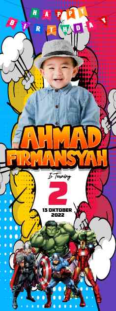 Di tengah langit biru yang cerah, berdirilah baliho megah yang menggambarkan pesta ulang tahun yang tak terlupakan. Langit dipenuhi dengan gambar-gambar para pahlawan super favorit: Iron Man, Captain America, Thor, Hulk, dan Black Widow, semuanya berkumpul dalam kekuatan mereka yang epik.