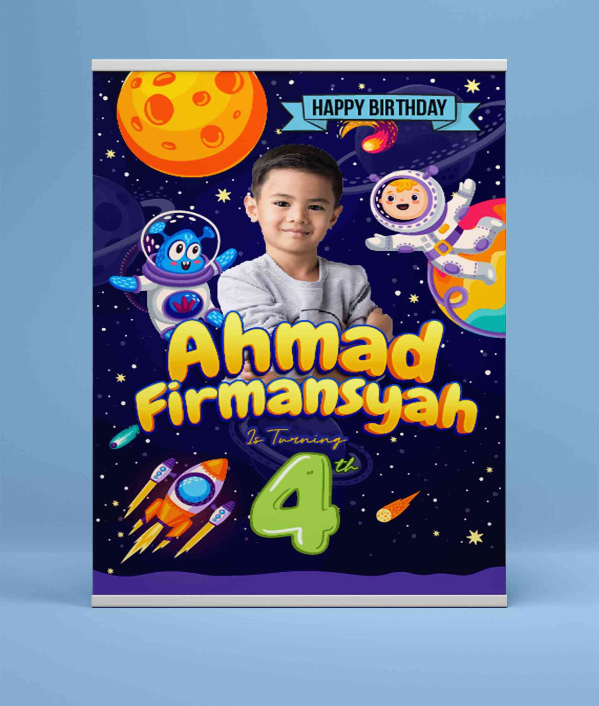 Dengan latar belakang kosmos yang luas, baliho ini menggambarkan perayaan yang luar biasa untuk memperingati HUT dengan tema NASA. Di tengah-tengah ba...