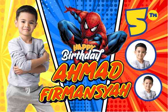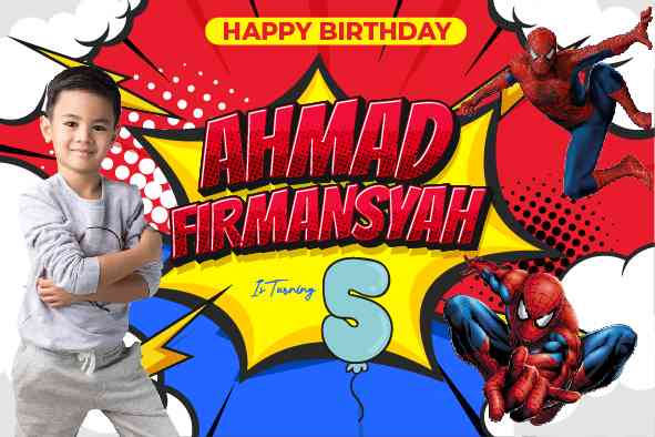 Baliho Hari Ulang Tahun Anak bertemakan Spiderman ini menampilkan desain yang ceria dan penuh warna, menciptakan suasana yang menyenangkan untuk meray...