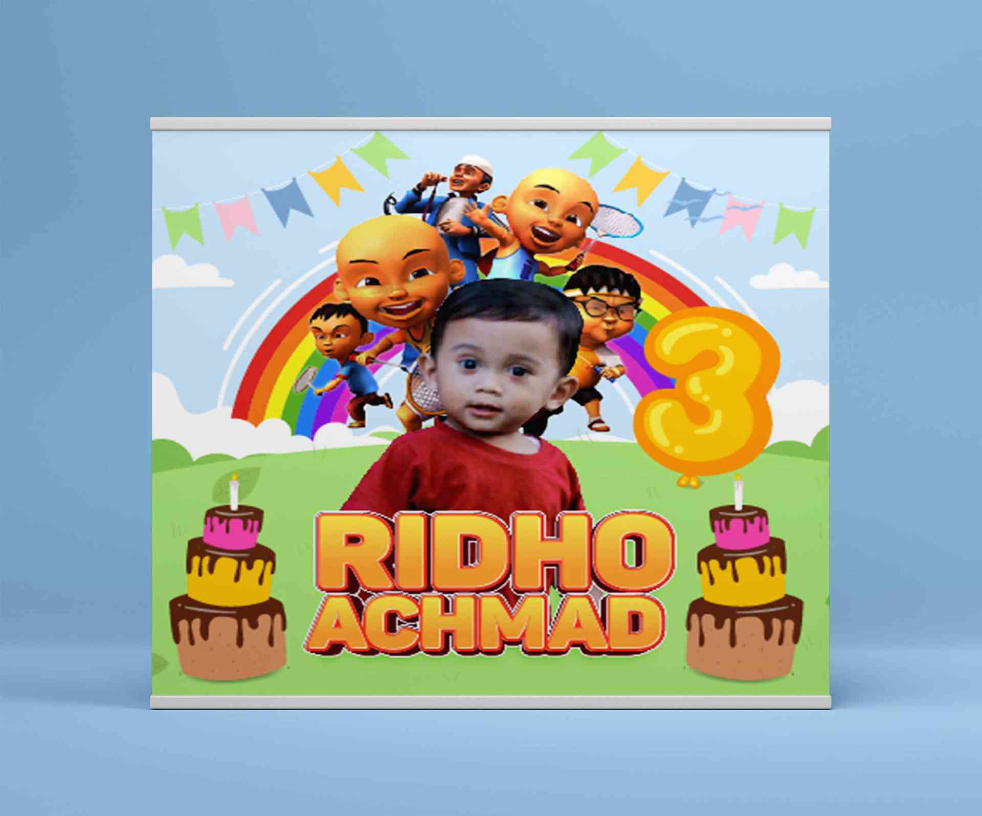 "Gelarlah perayaan ulang tahun yang tak terlupakan dengan tema Upin Ipin! Baliho berwarna cerah menggambarkan kegembiraan dan keceriaan dari karakter-...