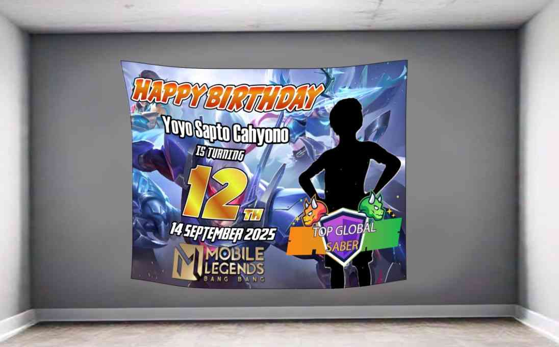 spanduk ulang tahun bertema Mobile Legends: Bang Bang untuk seseorang bernama Yoyo Sapto Cahyono yang merayakan ulang tahunnya yang ke-12 pada tanggal...
