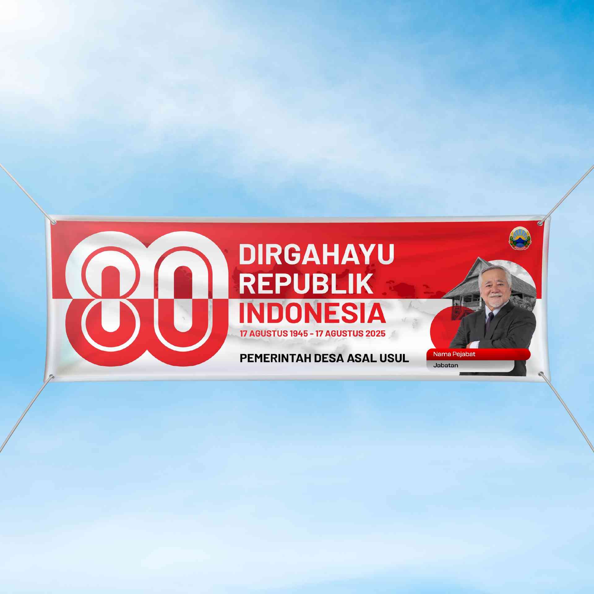 Baliho peringatan HUT ke-80 Republik Indonesia ini berbentuk persegi panjang horizontal dengan warna dominan merah dan sentuhan putih, menampilkan elemen visual utama berupa tulisan besar “Dirgahayu Republik Indonesia” berwarna kuning dan oranye, serta angka 80 yang menunjukkan usia kemerdekaan. Desain mencolok diperkuat dengan gambar ilustratif pahlawan nasional dan foto formal pejabat desa setempat, menonjolkan kesan resmi dan nasionalis. Produk ini sangat cocok digunakan oleh instansi pemerintahan desa untuk memperingati Hari Kemerdekaan dan menyampaikan ucapan resmi kepada masyarakat, khususnya pada lingkungan pemerintahan lokal.