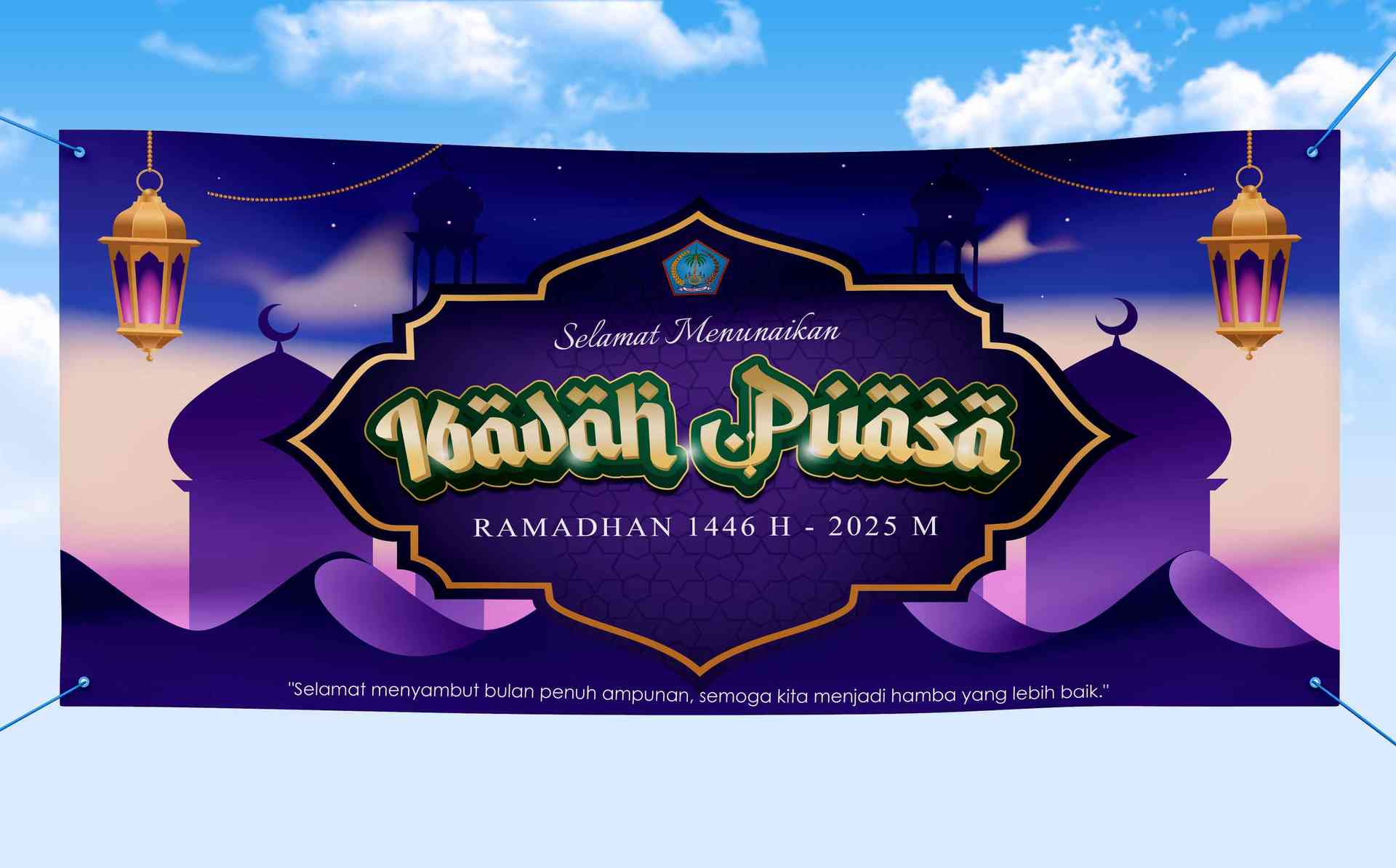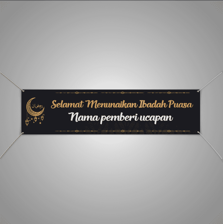Spanduk "Selamat Menunaikan Ibadah Puasa" ini memiliki desain yang elegan dan eksklusif dengan dominasi warna hitam dan emas, menciptakan tampilan mew...