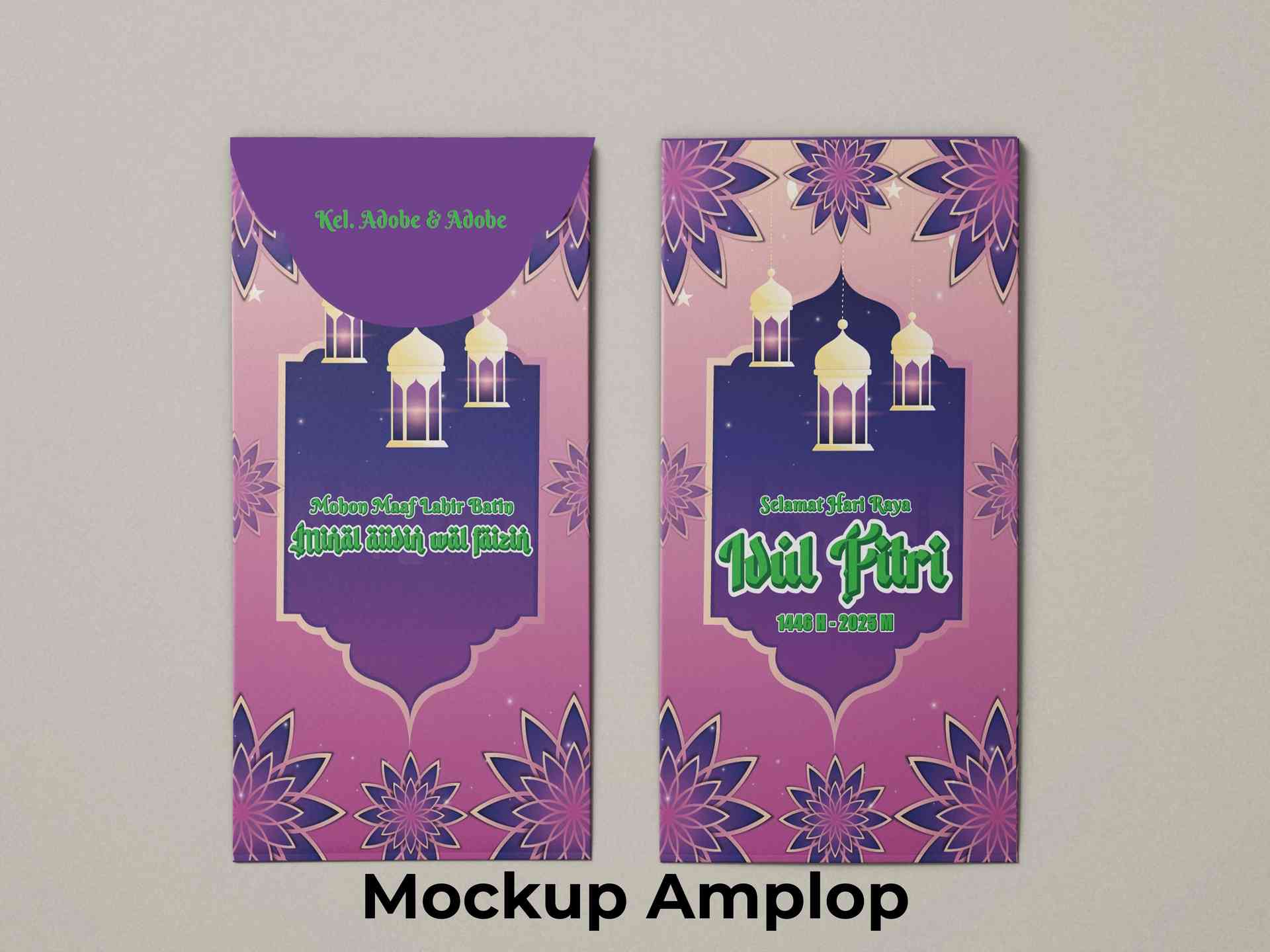 Desain amplop ini merupakan amplop lebaran dengan nuansa warna ungu dan pink yang memberikan kesan mewah dan elegan. Desainnya sarat dengan elemen isl...