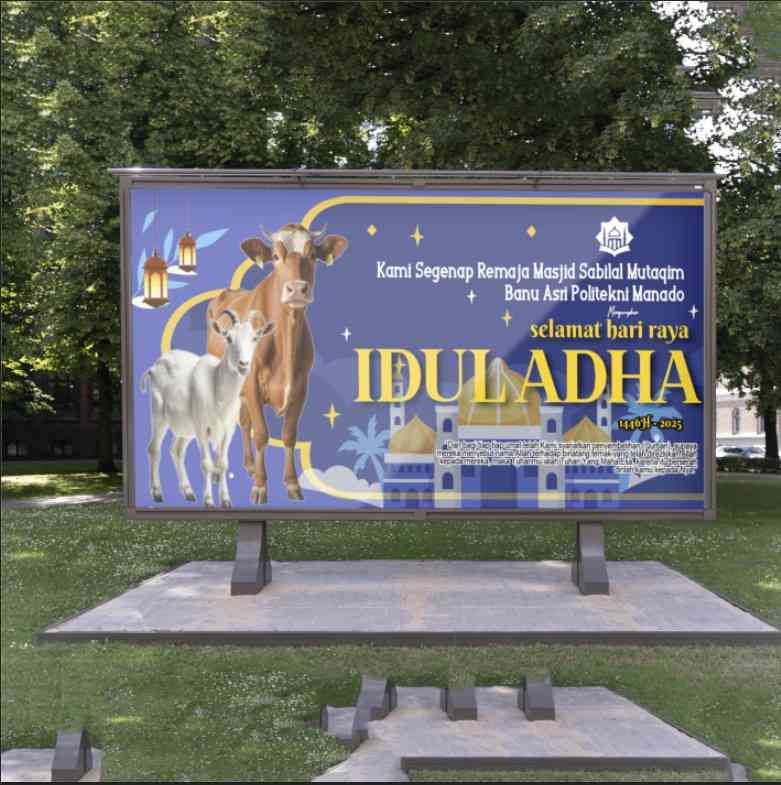 Desain baliho ini dibuat oleh Remaja Masjid Sabilal Mutaqin Banu Asri Politeknik Manado dalam rangka memperingati Hari Raya Idul Adha 1446 H / 2025 M....
