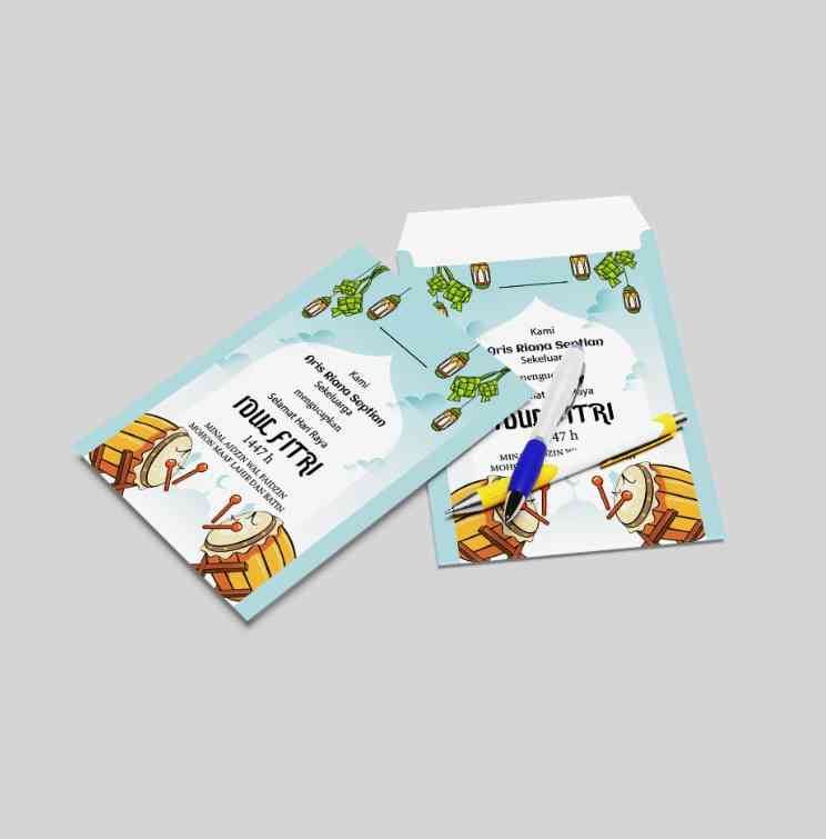 Desain amplop dan kartu ucapan ini tampil penuh keceriaan dengan dominasi warna biru langit yang memberi kesan damai dan menyegarkan. Ilustrasi ketupa...