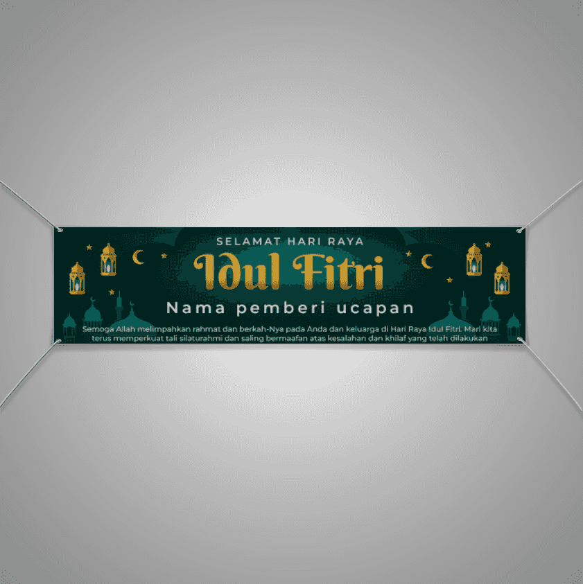 Spanduk Selamat Hari Raya Idul Fitri ini hadir dengan desain yang modern dan elegan, menggunakan kombinasi warna biru toska dan putih yang memberikan kesan sejuk dan damai. Tulisan "Idul Fitri" dibuat dengan font artistik berwarna putih dengan efek tiga dimensi, menonjolkan pesan utama dengan jelas. Latar belakang dihiasi dengan ornamen lentera emas yang menggantung, awan putih yang lembut, serta bintang-bintang kecil, menciptakan suasana Islami yang khas. Di bagian bawah terdapat pesan ucapan yang mengajak untuk mempererat tali silaturahmi dan saling memaafkan di hari yang penuh berkah ini. Nama pemberi ucapan dapat disesuaikan, menjadikannya cocok untuk keperluan pribadi, bisnis, instansi, maupun komunitas yang ingin menyampaikan ucapan Idul Fitri dengan tampilan eksklusif dan profesional.