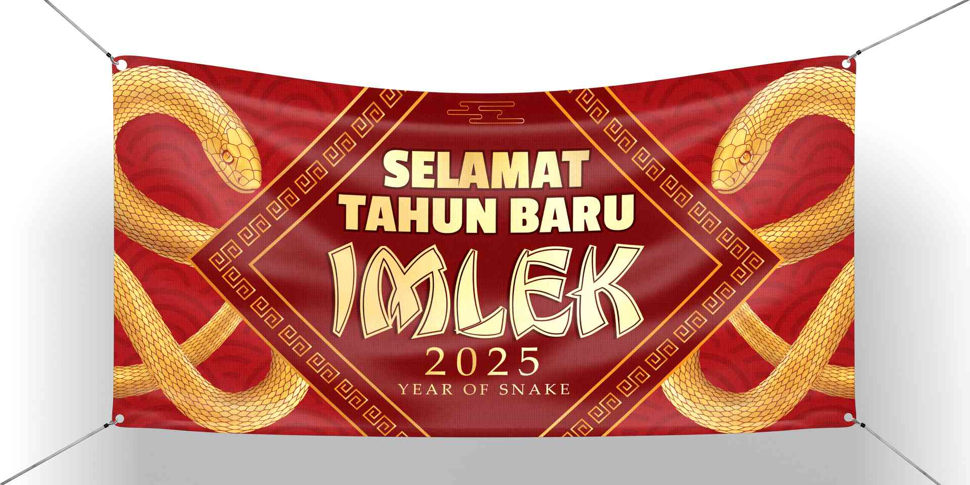 Baliho berukuran besar dengan tema Imlek ini memancarkan kemewahan dan kemeriahan khas perayaan Tahun Baru Imlek. Latar belakangnya didominasi oleh warna merah cerah, melambangkan keberuntungan dan kebahagiaan, dihiasi pola-pola tradisional seperti awan keberuntungan dan motif bunga peony. Warna emas digunakan secara menonjol pada teks dan elemen dekoratif, memberikan kesan kemakmuran dan keberlimpahan.