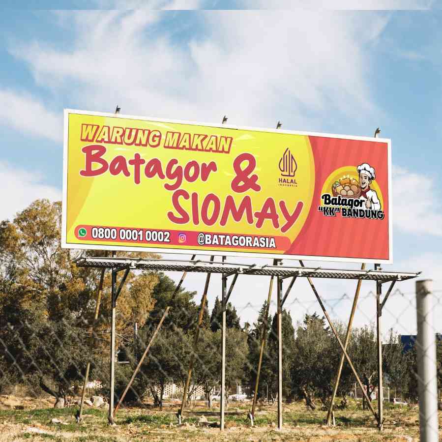 desain billboard warung makan batagor "kk" bandung dengan warna latar merah dan kuning cerah yang mencolok. terdapat logo halal indonesia, kontak what...