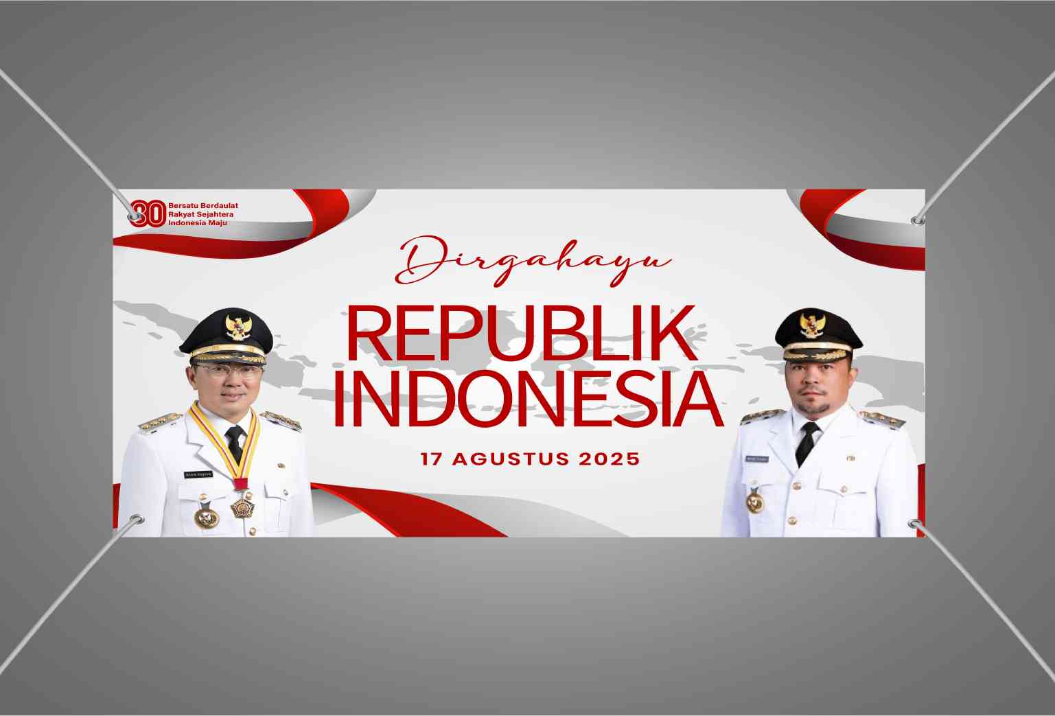 Baliho Kemerdekaan ini berbentuk persegi panjang dengan dominasi warna merah dan emas, menampilkan desain visual yang elegan dan modern. Elemen mencolok berupa tulisan besar “Dirgahayu Republik Indonesia” dilengkapi tanggal perayaan 17 Agustus 2025, serta ilustrasi pita atau bendera merah putih yang menonjolkan semangat nasionalisme. Di sisi kiri baliho terdapat foto dua pejabat mengenakan seragam resmi putih, menambah nuansa formal dan otoritatif. Tema visual berkisar pada peringatan kemerdekaan Indonesia, sangat cocok digunakan oleh instansi pemerintah, perusahaan, atau lembaga sebagai media promosi dan ucapan resmi kepada masyarakat.