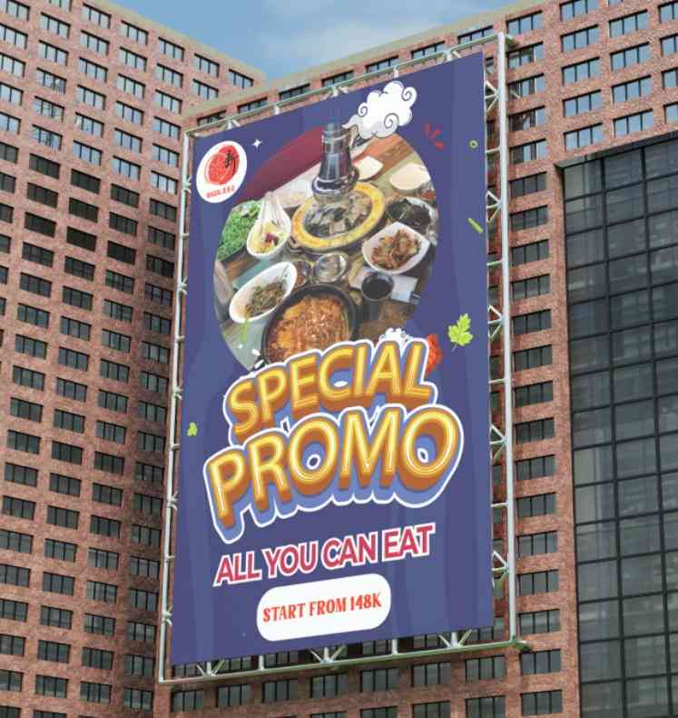 Baliho ini menonjolkan promo spesial dari restoran Magal BBQ dengan konsep “All You Can Eat” yang menggoda. Teks utama “SPECIAL PROMO” ditampilkan bes...
