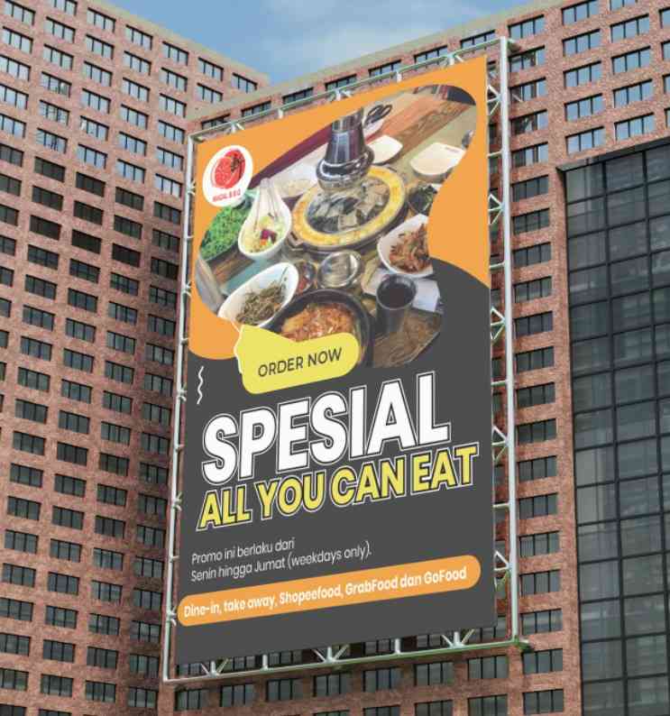 Baliho ini menampilkan penawaran khusus dari Magal BBQ berupa promo “All You Can Eat” yang berlaku dari Senin hingga Jumat. Desain menggunakan latar abu-abu netral yang dikombinasikan dengan aksen oranye cerah, memberikan kesan profesional namun tetap menggugah selera. Teks “SPESIAL ALL YOU CAN EAT” dicetak besar dan tebal dengan warna putih dan kuning keemasan, mempertegas nilai promo yang ditawarkan. Di sisi kanan, terdapat gambar bulat hidangan BBQ khas Korea, mulai dari grill daging hingga berbagai lauk dan kuah pedas. Informasi layanan seperti dine-in, take away, dan pemesanan via Shopeefood, GrabFood, serta GoFood disusun rapi di bagian bawah untuk menjangkau semua kebutuhan pelanggan.