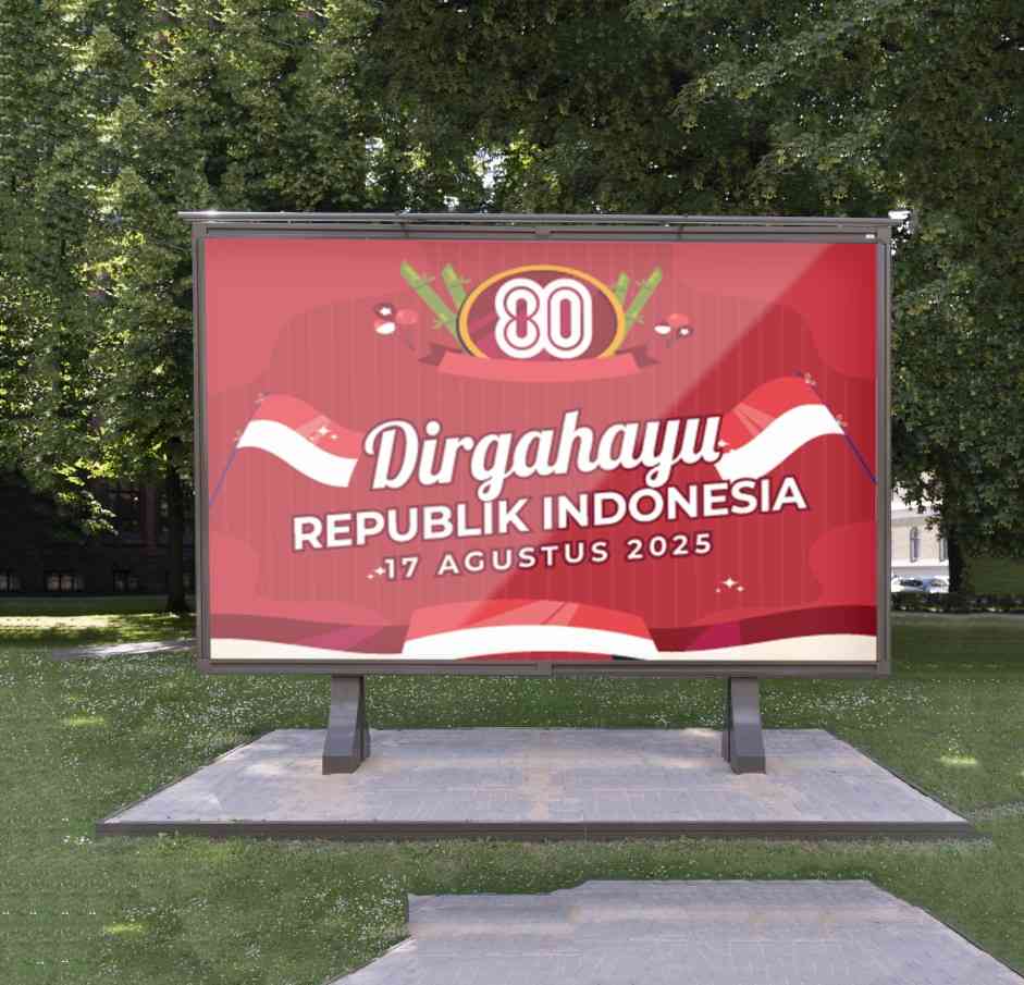 Baliho bertema kemerdekaan ini berbentuk persegi panjang dengan warna dominan merah dan elemen visual mencolok berupa angka 80 yang dikelilingi ilustr...