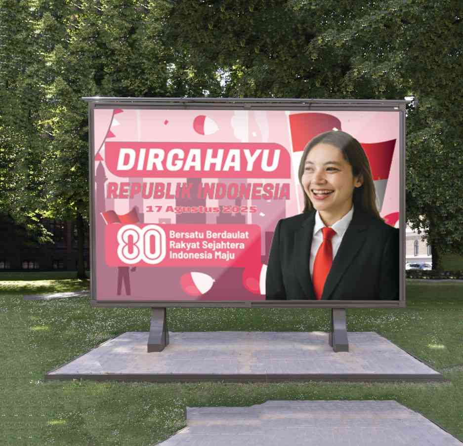 Baliho kemerdekaan dengan tema merah putih ini berbentuk persegi panjang, menampilkan visual dominan warna merah dan putih serta elemen khas kemerdekaan seperti bendera, balon, dan angka “80” menandakan HUT RI ke-80. Tulisan besar “Dirgahayu Republik Indonesia” dan tanggal “17 Agustus 2025” menjadi pusat perhatian, didukung slogan “Bersatu Berdaulat Rakyat Sejahtera Indonesia Maju”. Gambar seorang perempuan berpakaian formal menghiasi sisi kanan, menghadirkan nuansa profesional dan semangat nasionalisme. Produk baliho ini cocok digunakan dalam kampanye HUT RI, ditujukan untuk instansi pemerintah, korporasi, atau komunitas yang ingin mengedepankan identitas nasional dan memperingati kemerdekaan.