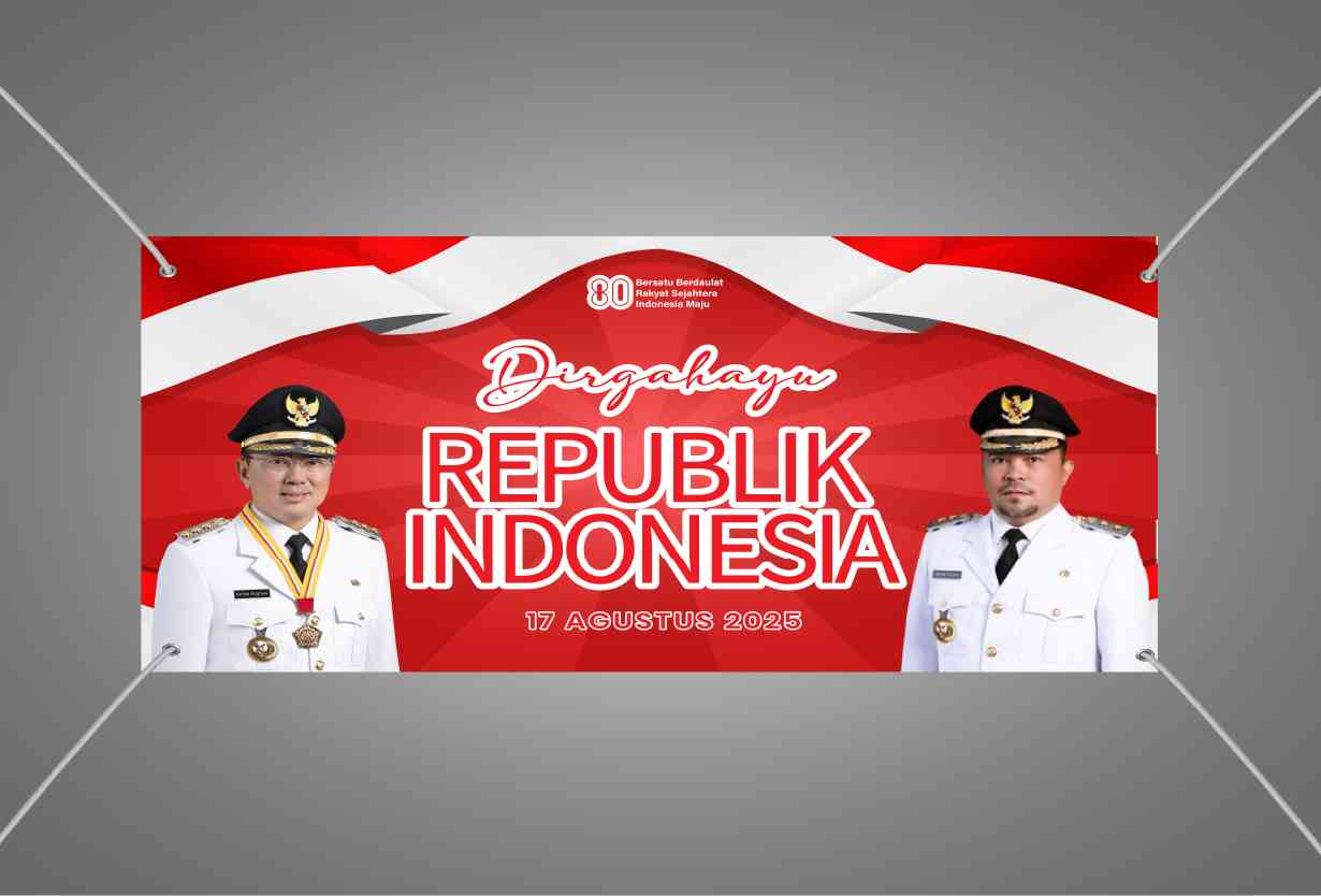 Spanduk peringatan Hari Kemerdekaan Republik Indonesia menampilkan dominasi warna merah dan putih dengan ilustrasi dua tokoh pejabat pemerintah berpak...
