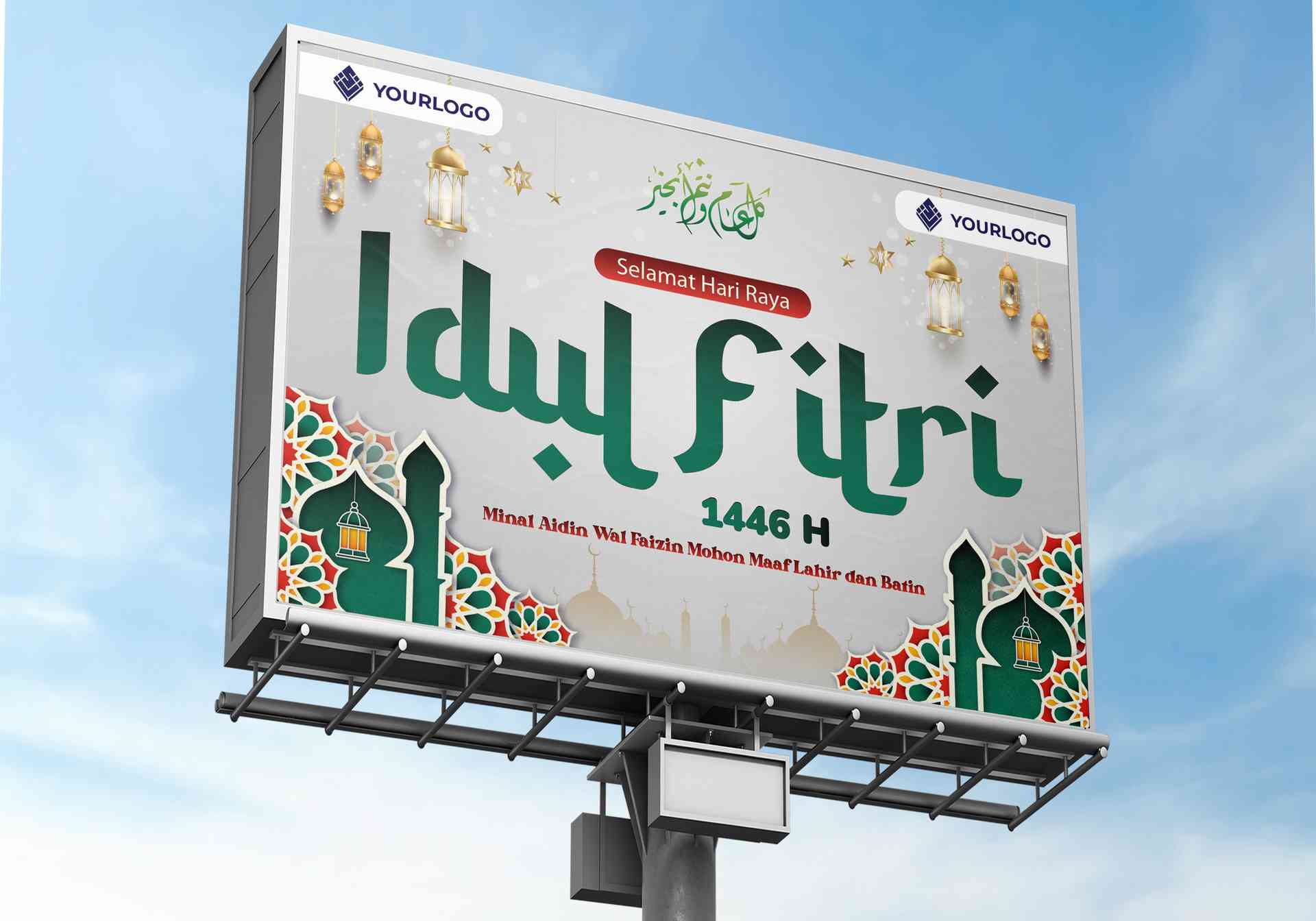 Gambar ini menampilkan sebuah papan reklame (billboard) dengan ucapan Selamat Hari Raya Idul Fitri 1446 H. Desain billboard memiliki tampilan yang mod...