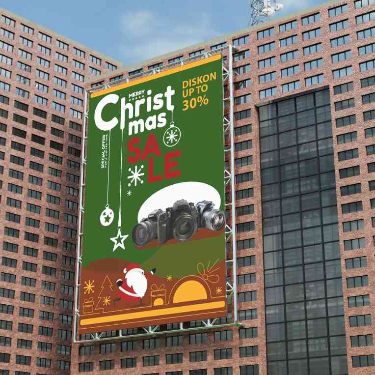 Baliho promosi bertema Natal ini menampilkan penawaran diskon hingga 30% untuk pembelian kamera, dengan tulisan besar “Christmas Sale” dan elemen deko...