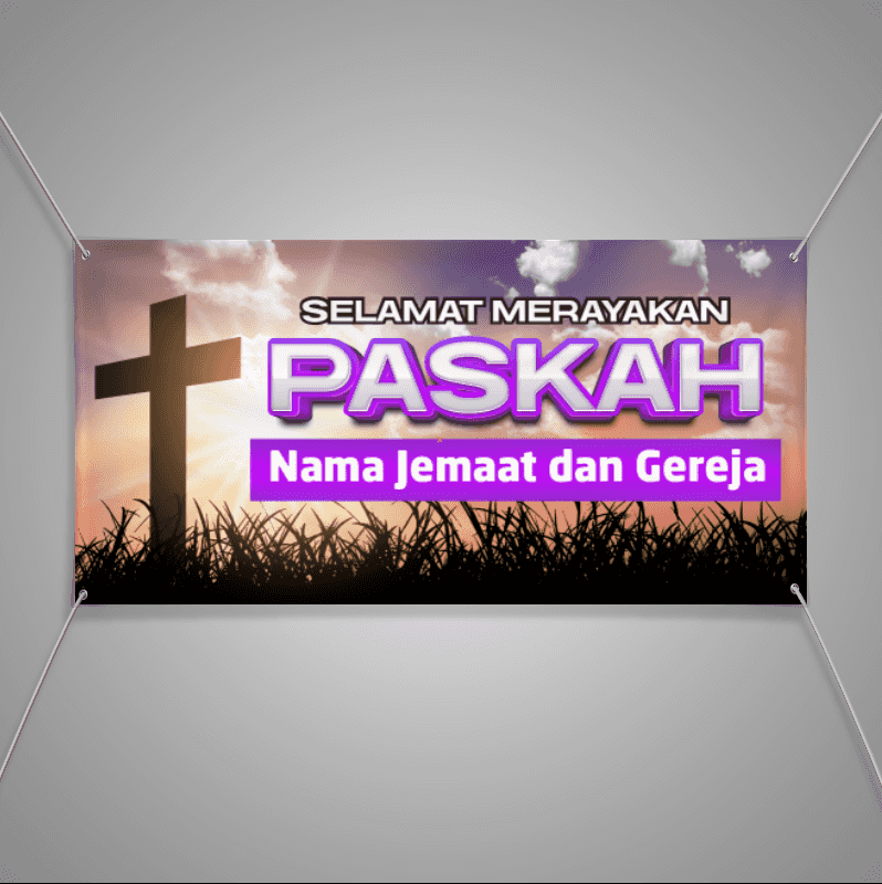 Spanduk Paskah dan Jumat Agung ini memiliki desain yang khas dengan latar belakang nuansa ungu, warna yang sering dikaitkan dengan refleksi dan spirit...
